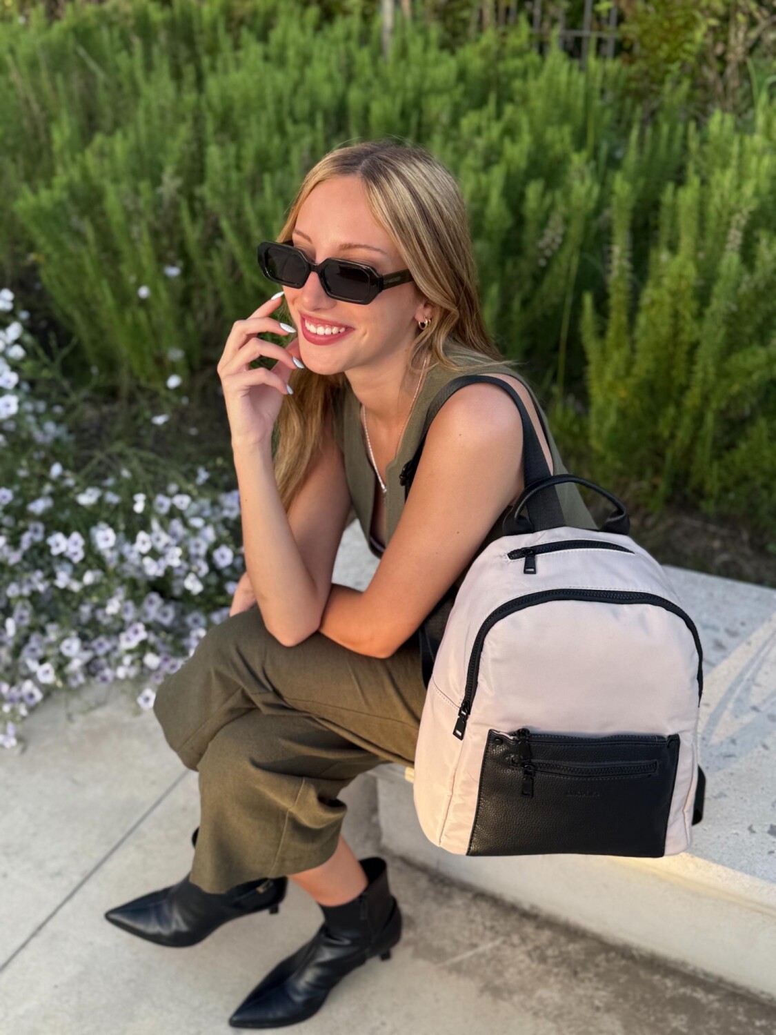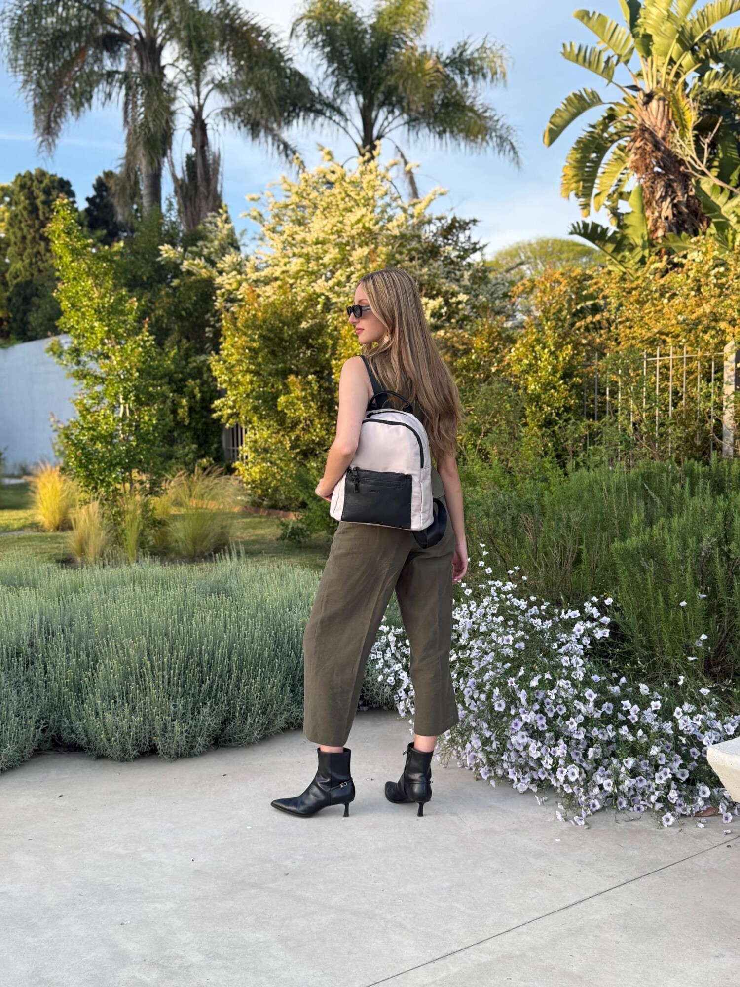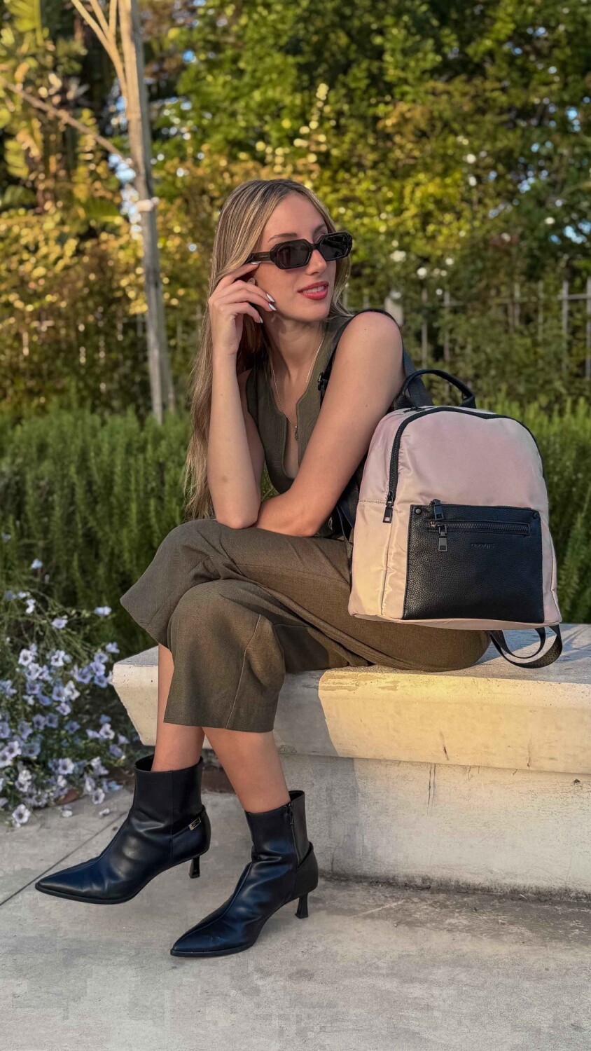 Mochila urbana de diseño moderno, combinado, tela resistente y con detalle en símil cuero. cuenta con amplio compartimiento principal y bolsillo frontal con cierre, ideal para llevar tus pertenencias con estilo y comodidad.