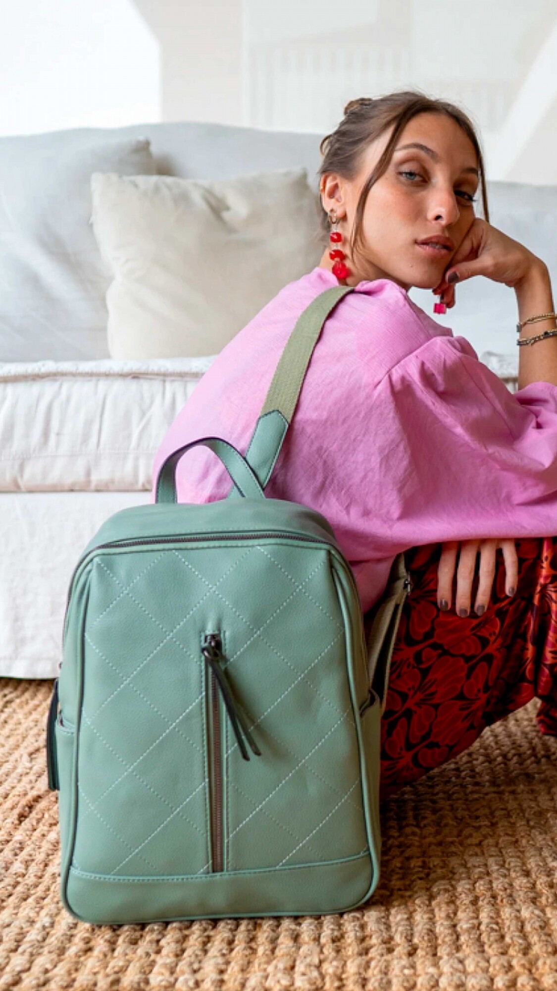 Mochila en símil con detalle al frente en costura costura . Bolsillo frontal con cierre vertical.
