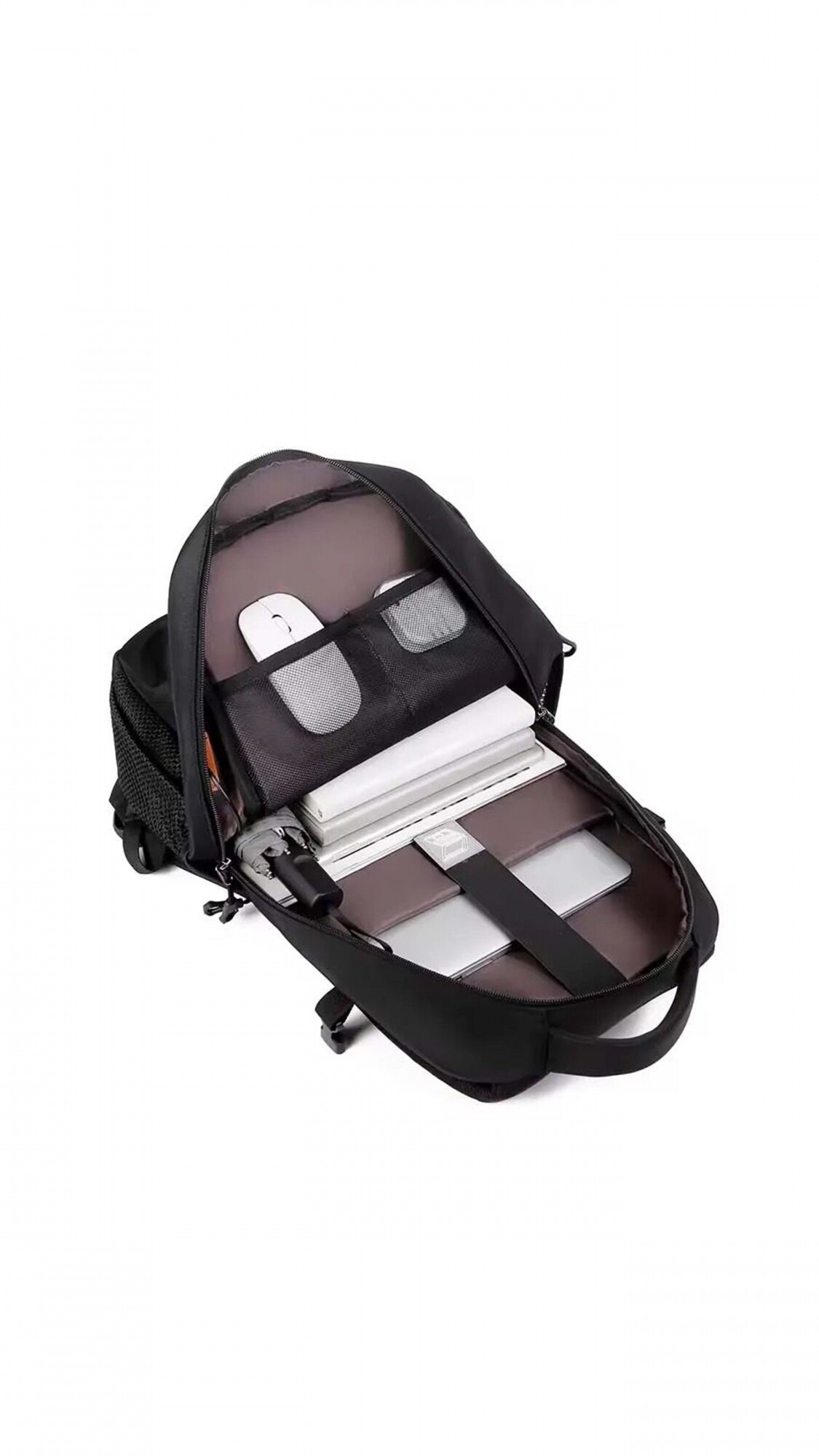 Mochila con bolsillo frontal vertical y capacidad para notebook. Incluye bolsillos laterales de rejilla, además de una faja y un bolsillo en la espalda para sujetarla a la valija. Ofrece comodidad y organización, ideal para el uso diario o para viajar.