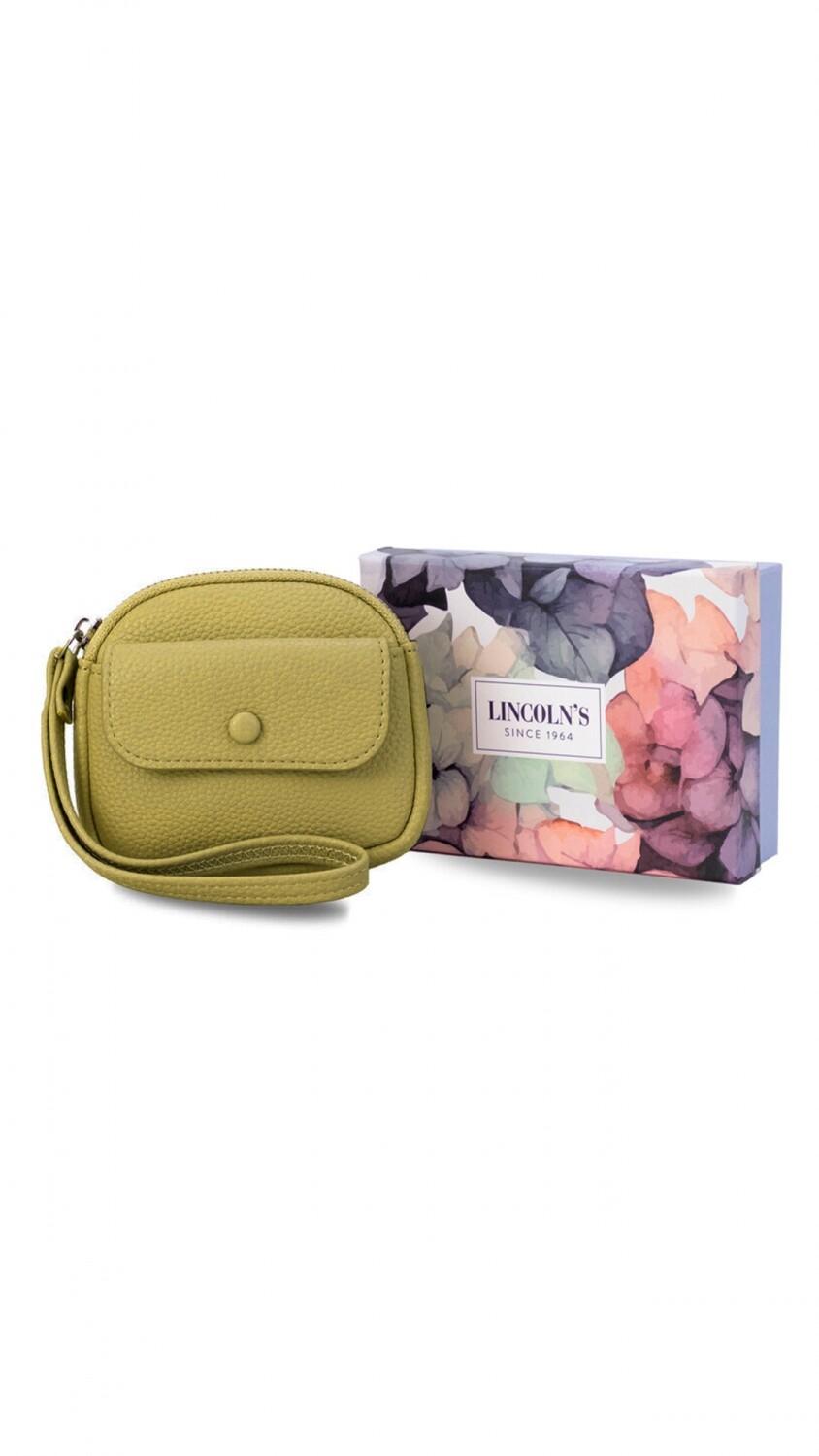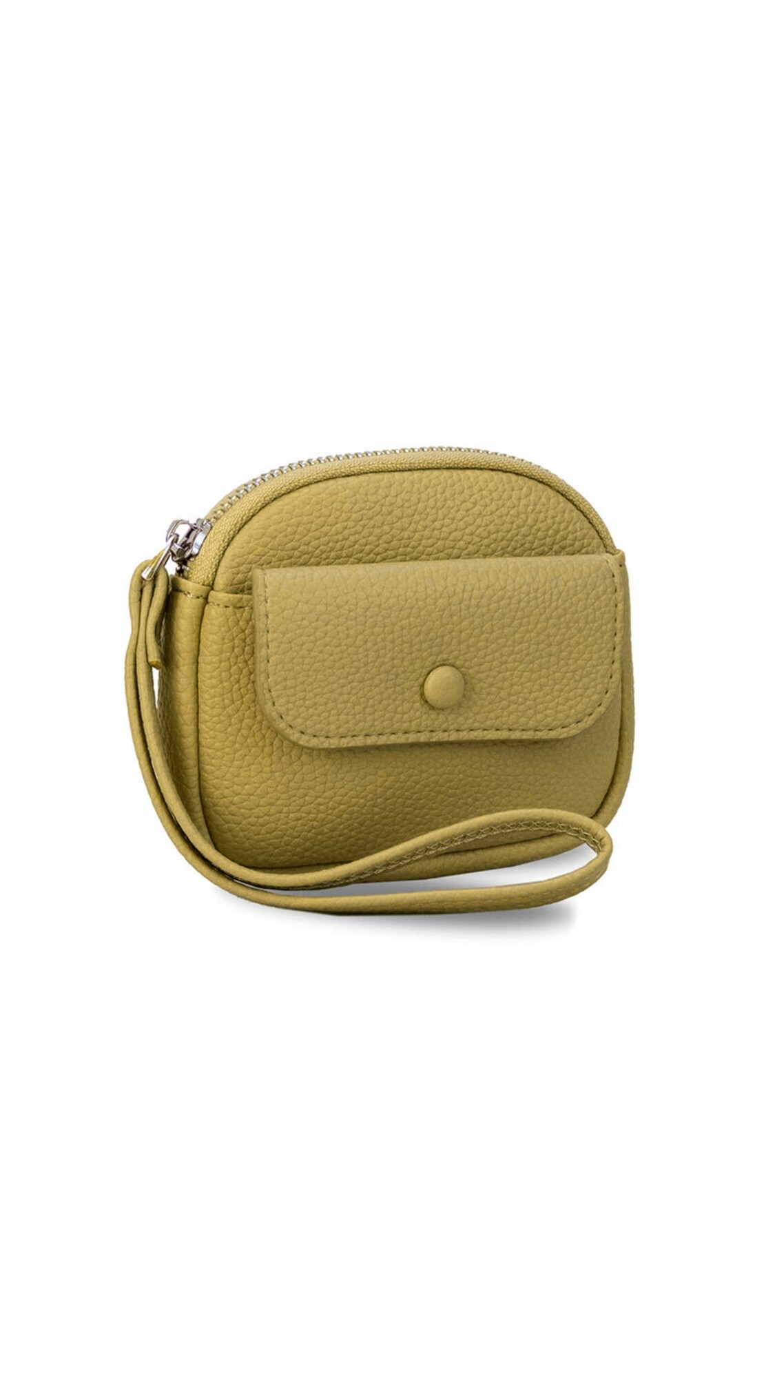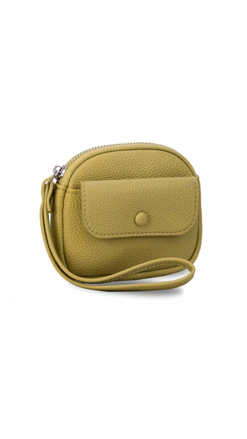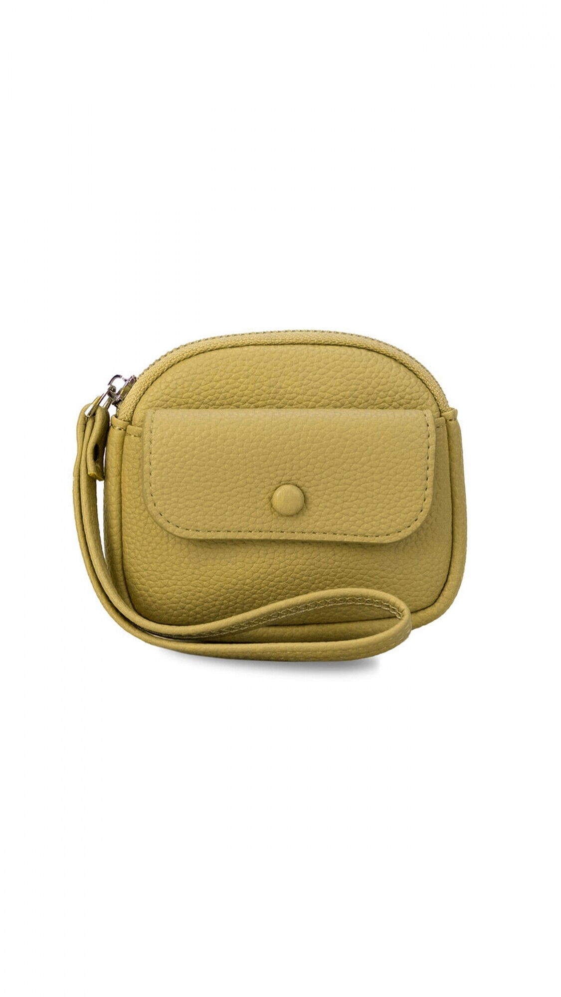 Monedero de dama con correa de mano, diseño práctico y compacto. Su bolsillo principal con cierre cuenta con un portallaves, y un bolsillo frontal pequeño con botón para objetos pequeños.