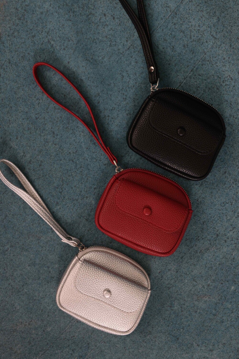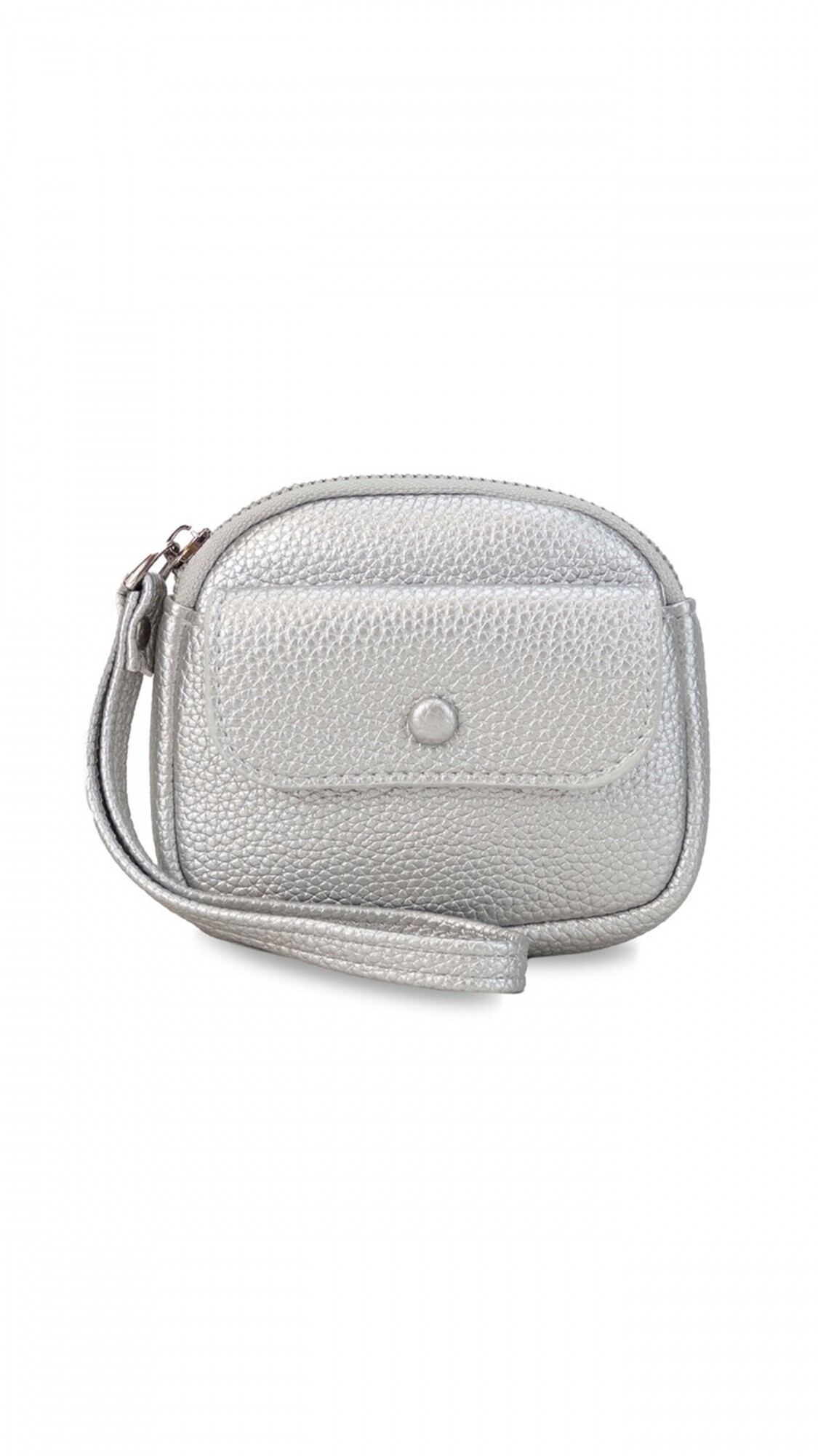 Monedero de dama con correa de mano, diseño práctico y compacto. Su bolsillo principal con cierre cuenta con un portallaves, y un bolsillo frontal pequeño con botón para objetos pequeños.