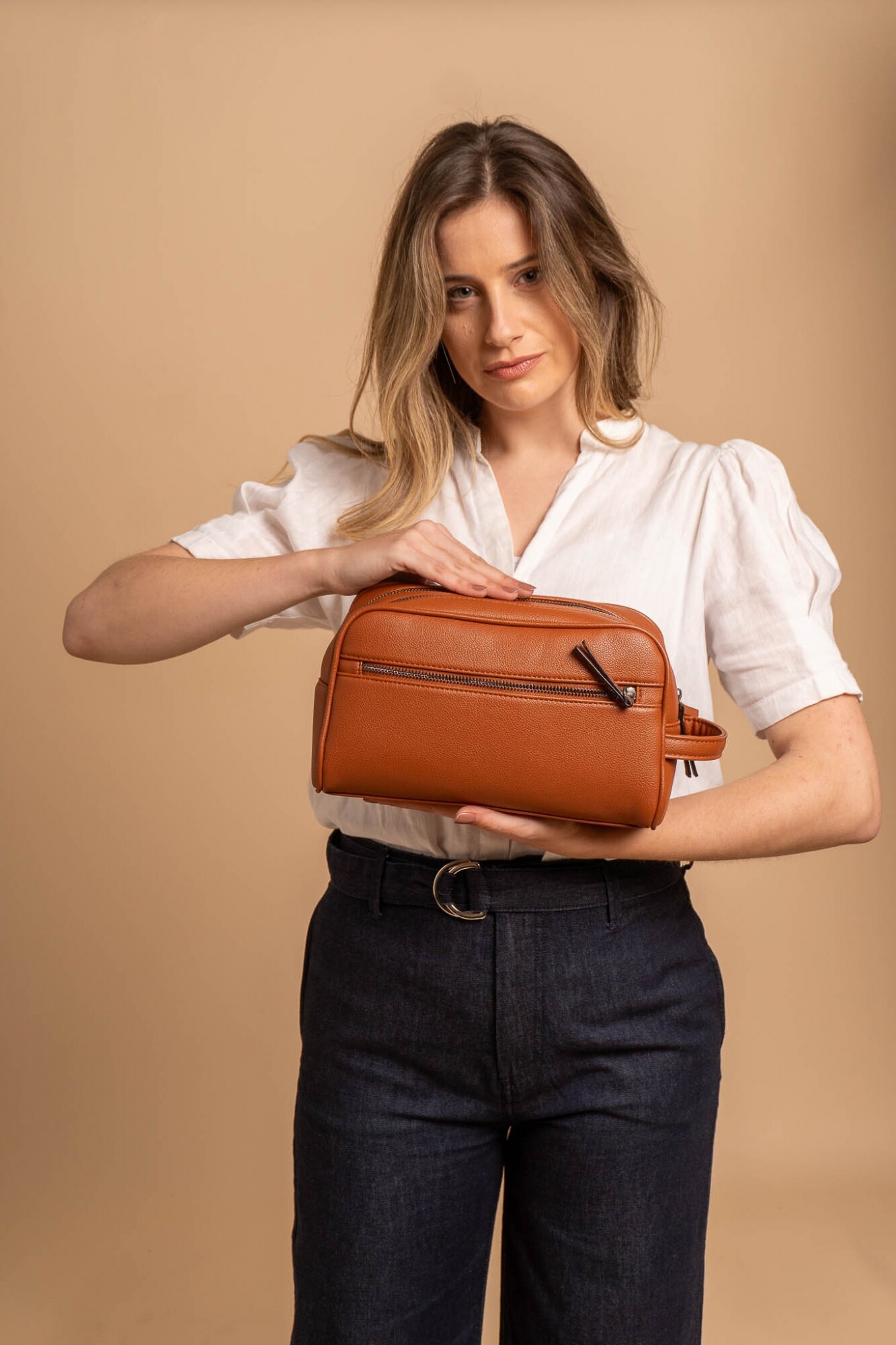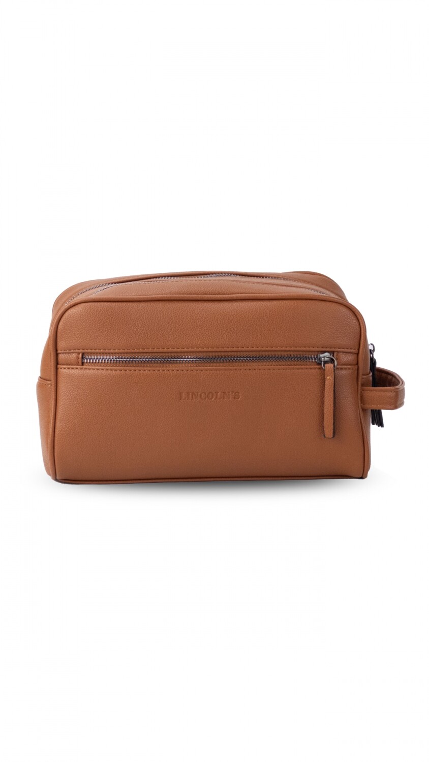 Neceser unisex de símil cuero, con doble compartimento superior y bolsillo frontal con cierre. Diseño elegante y funcional, ideal para organizar artículos de cuidado personal en viajes. Asa lateral para fácil transporte.
