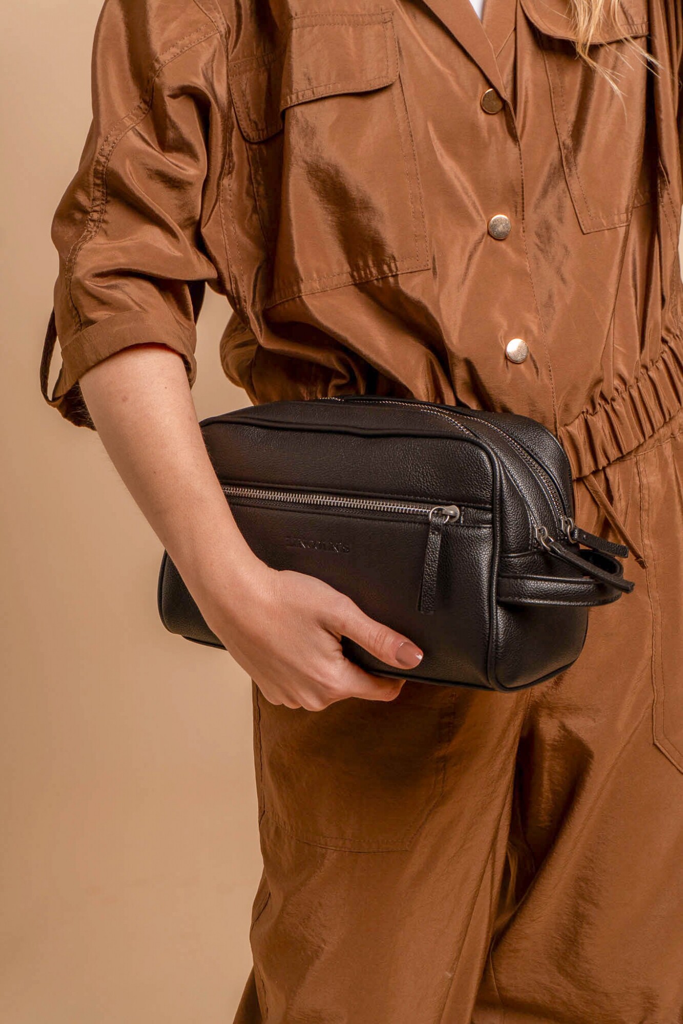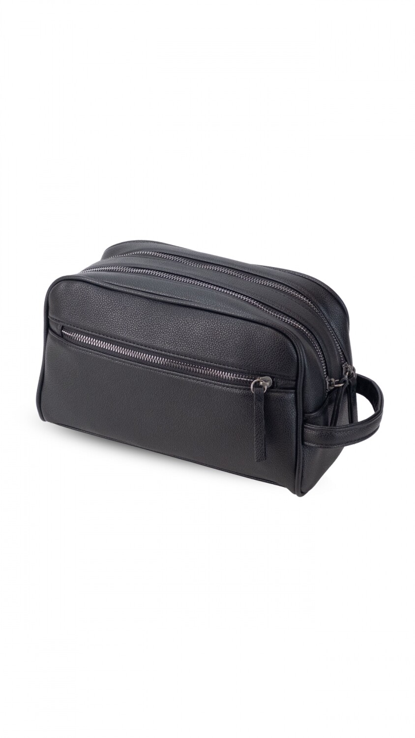 Neceser unisex de símil cuero, con doble compartimento superior y bolsillo frontal con cierre. Diseño elegante y funcional, ideal para organizar artículos de cuidado personal en viajes. Asa lateral para fácil transporte.