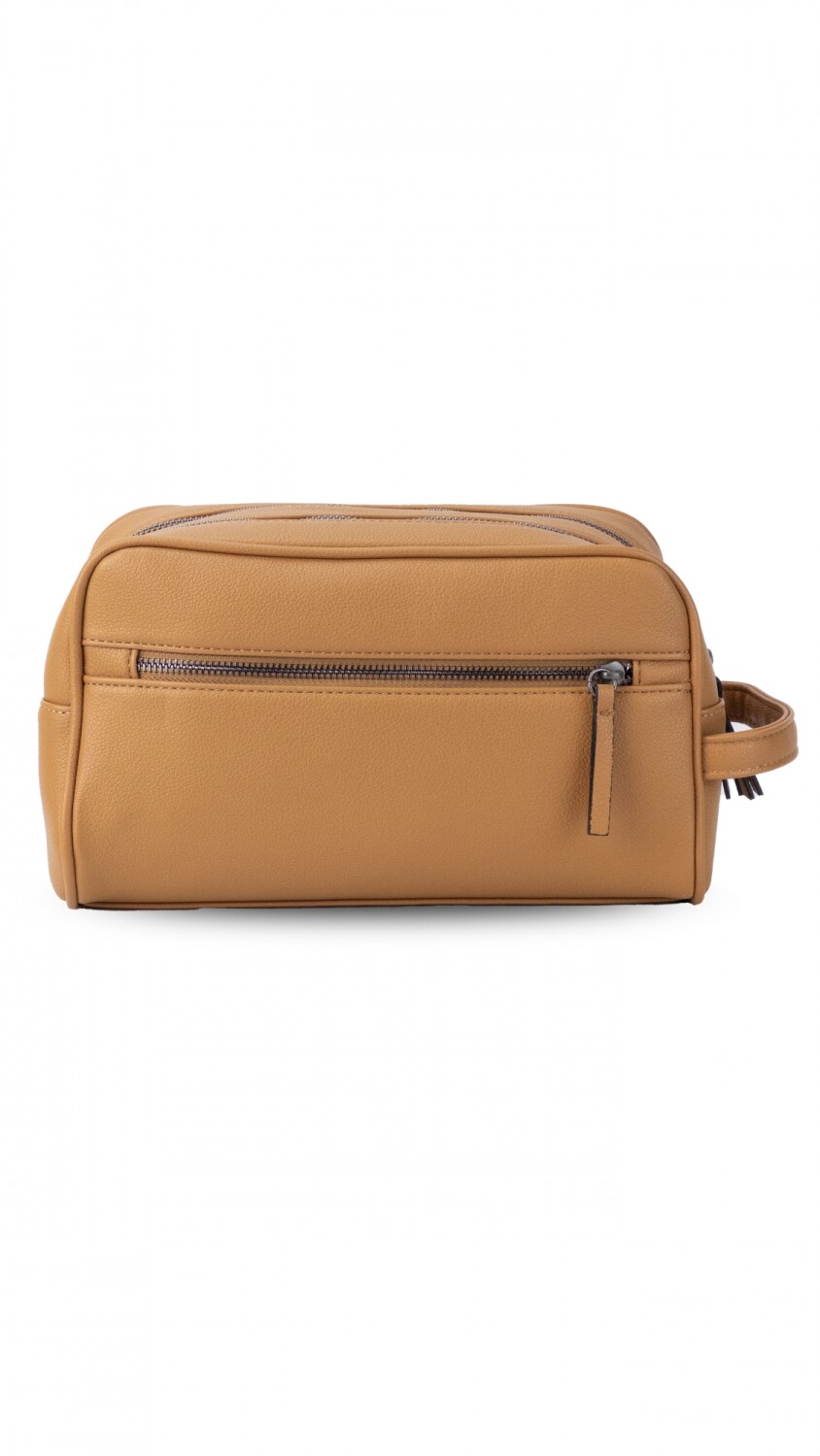 Neceser unisex de símil cuero, con doble compartimento superior y bolsillo frontal con cierre. Diseño elegante y funcional, ideal para organizar artículos de cuidado personal en viajes. Asa lateral para fácil transporte.