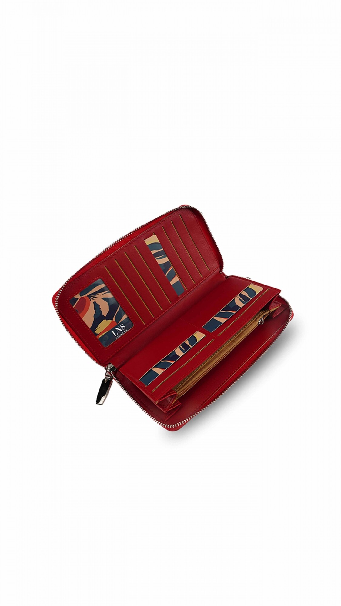 Por dentro bolsillos para documentos, reparticiones para tarjetas y división para billetes.