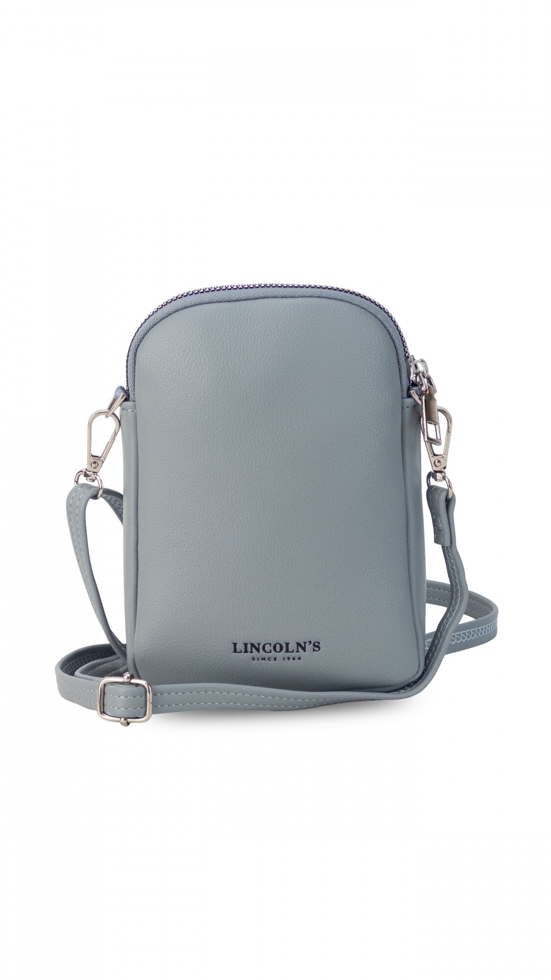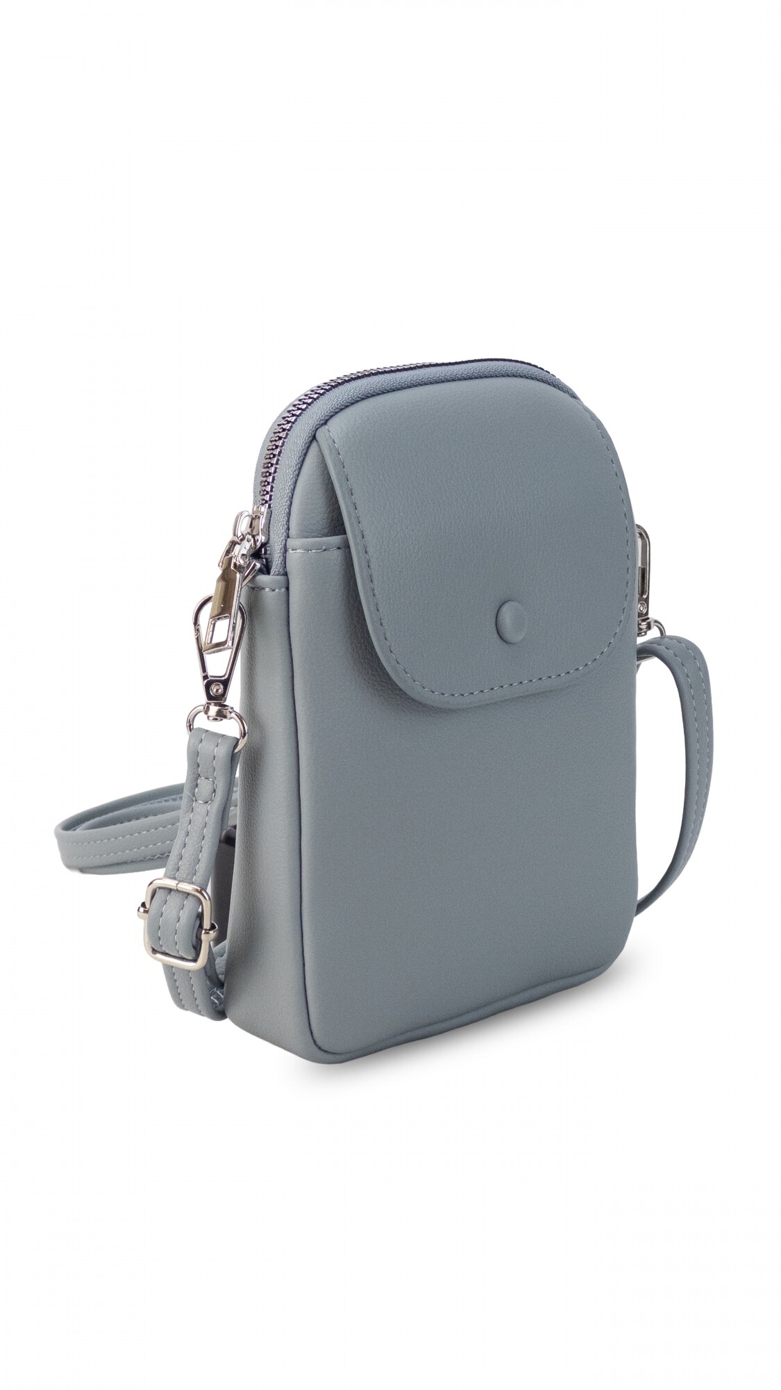 Bandolera pequeña y compacta realizada en símil cuero, con correa ajustable del mismo material. Cuenta con cierre principal y bolsillo frontal con tapa y broche metálico.