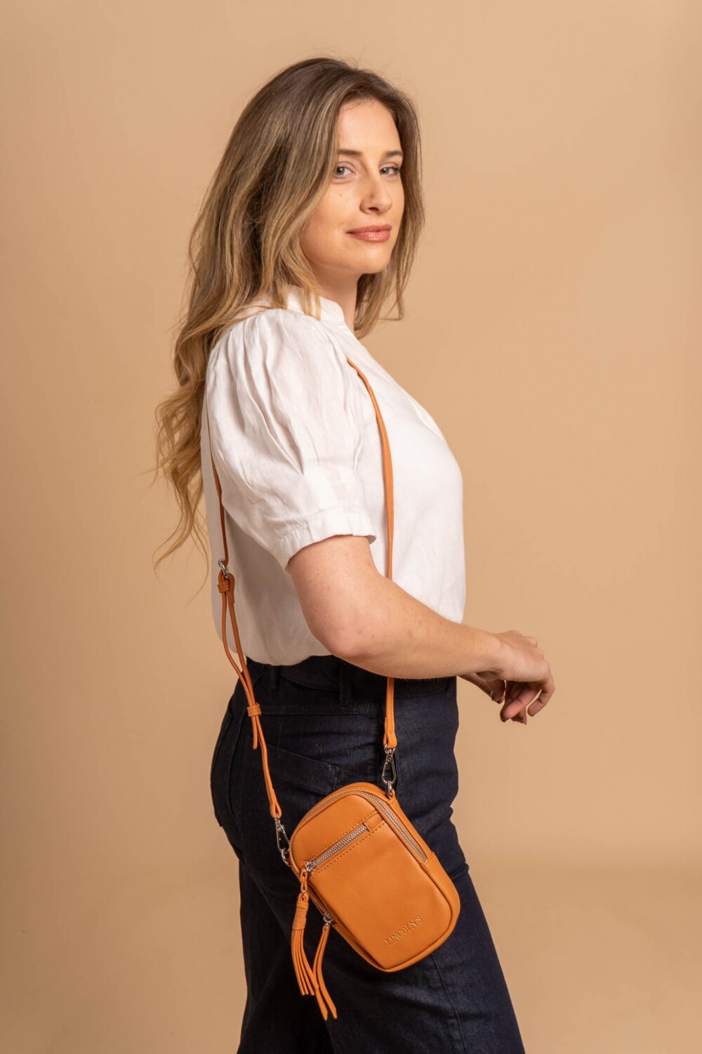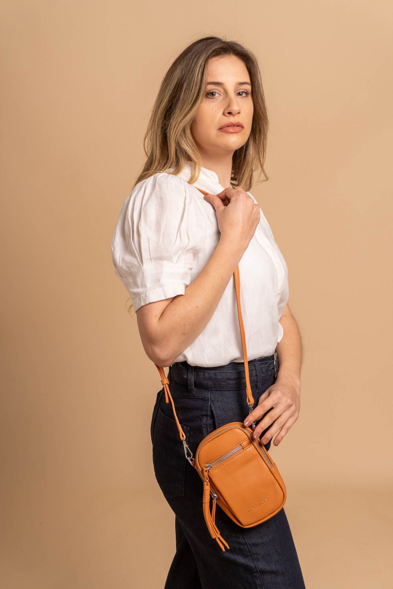 Bandolera compacta y moderna con correa regulable y desmontable. Apertura superior. Bolsillo frontal con cierre y otro trasero sin cierre.