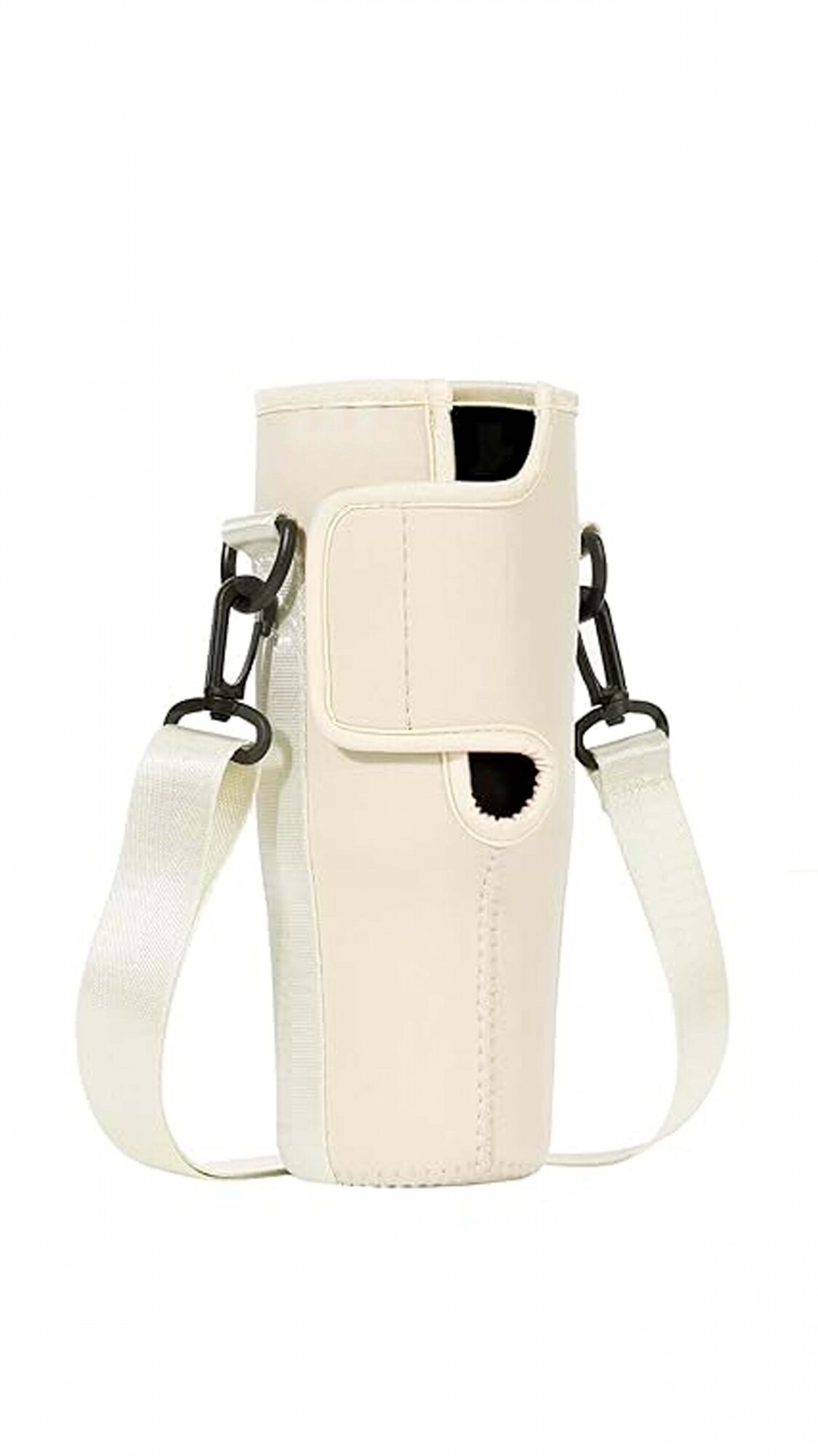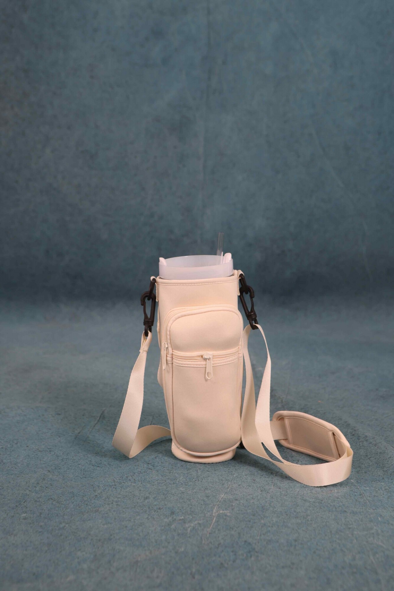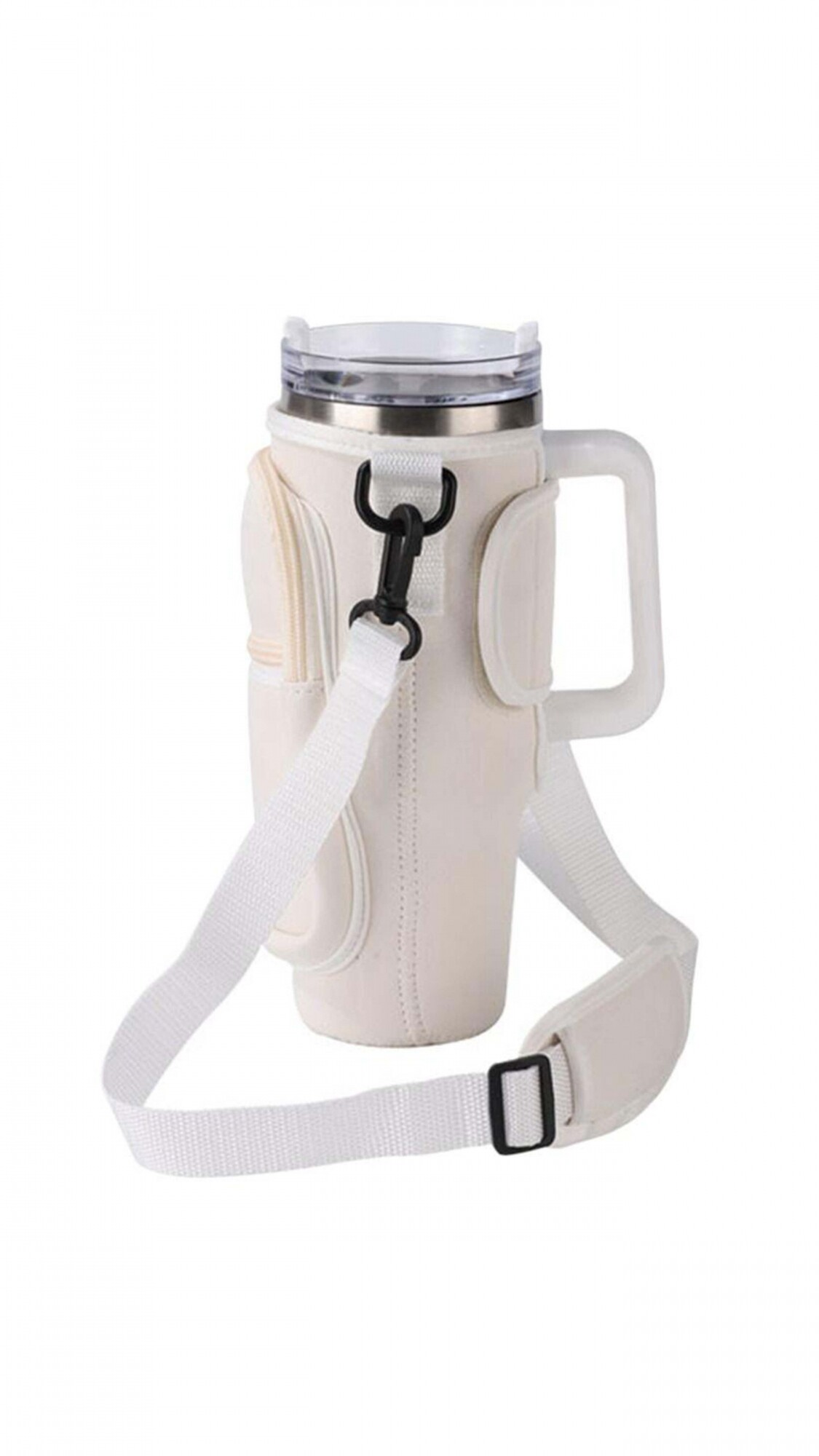 Porta botella en Neopreno, material flexible y liviano. Cuenta con dos bolsillos al frente con cierre y asa de colgar.