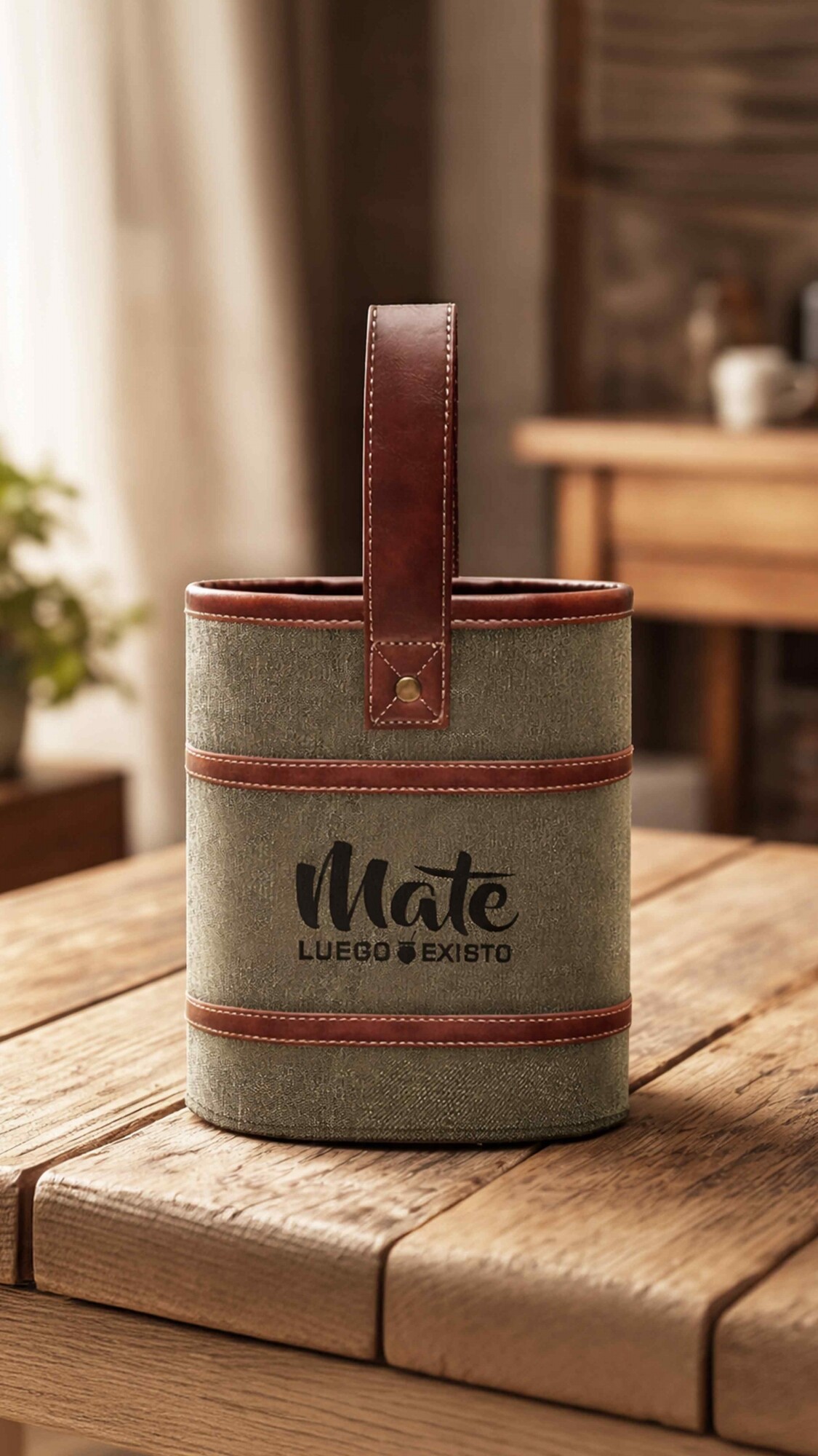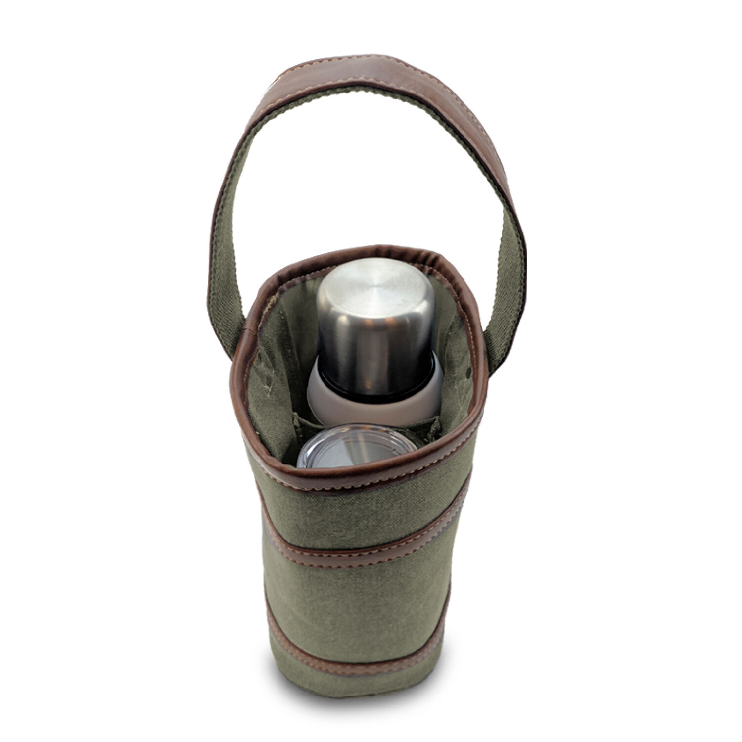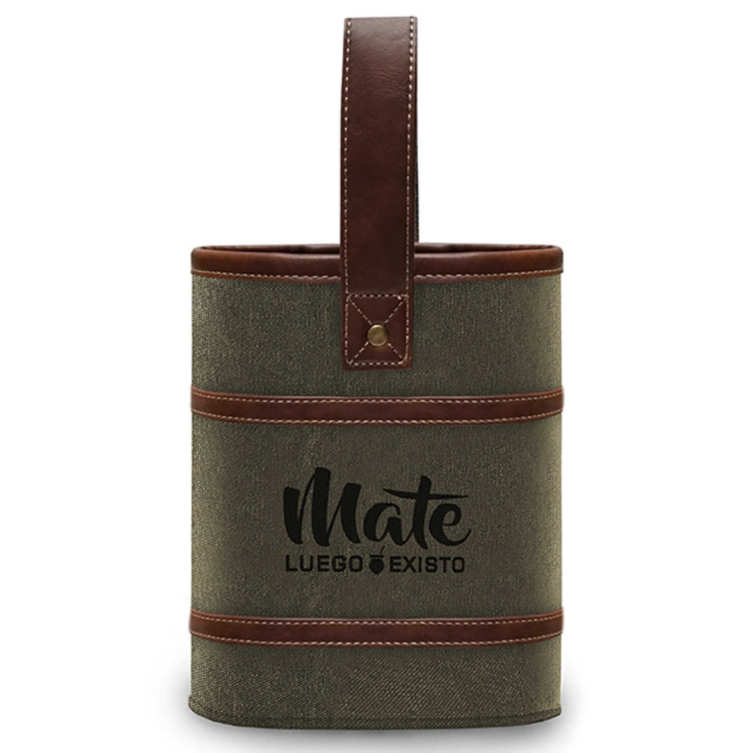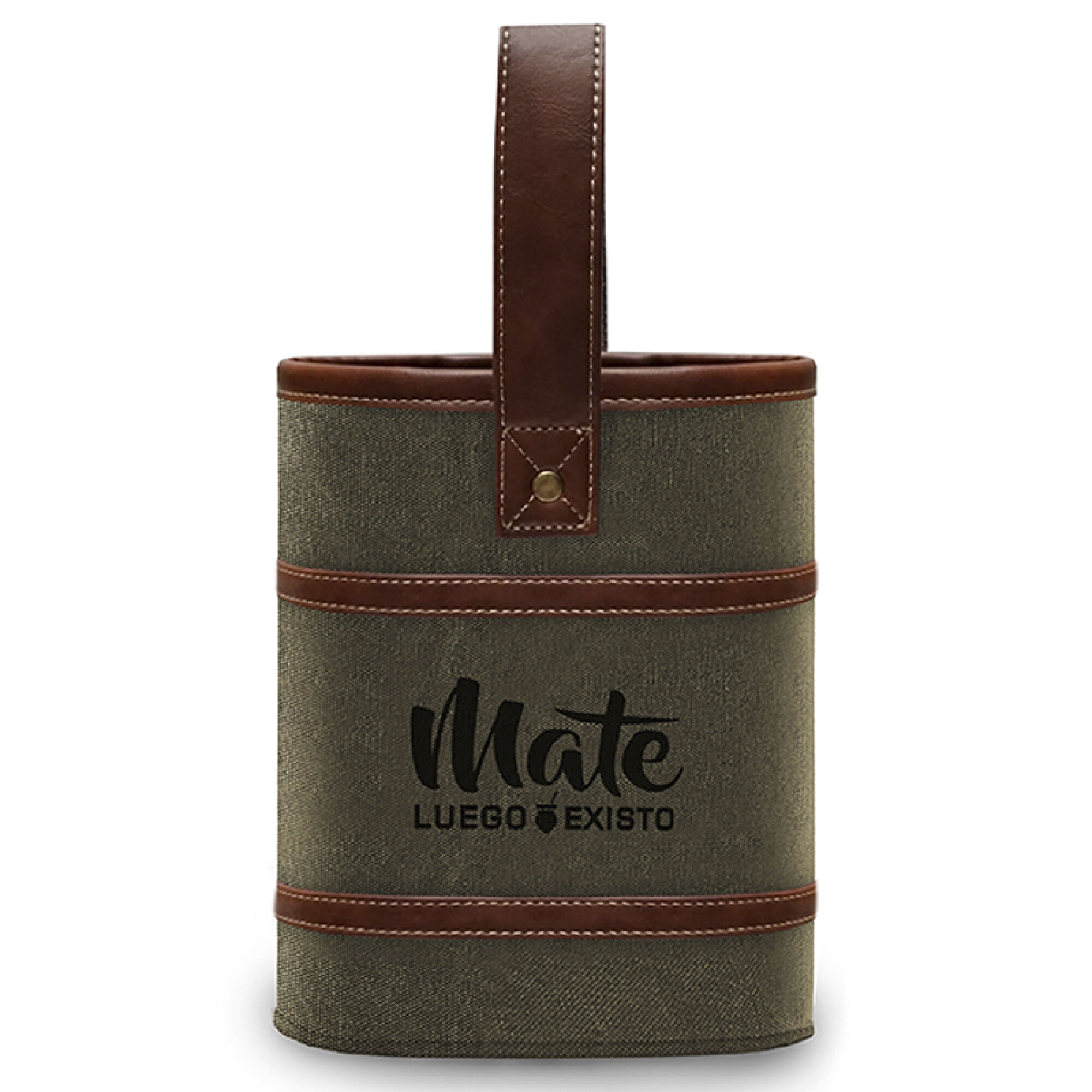 Posa termo en canvas combinado con símil cuero y estampa al frente. Asa de mano y división al medio.