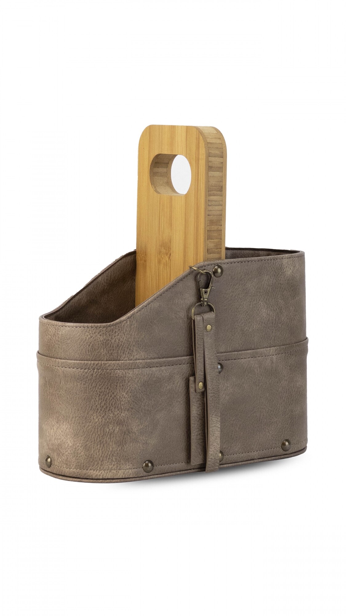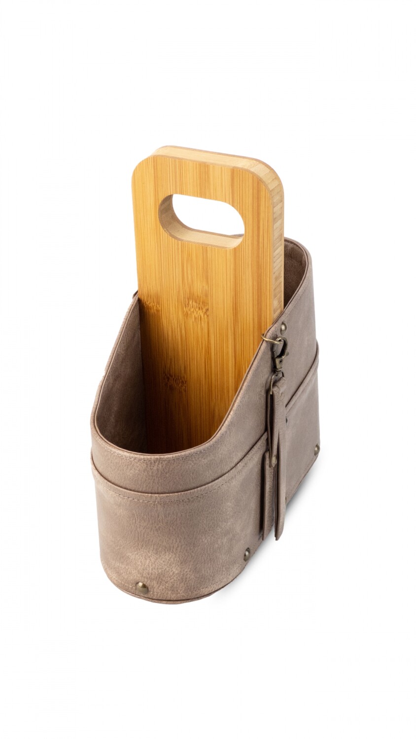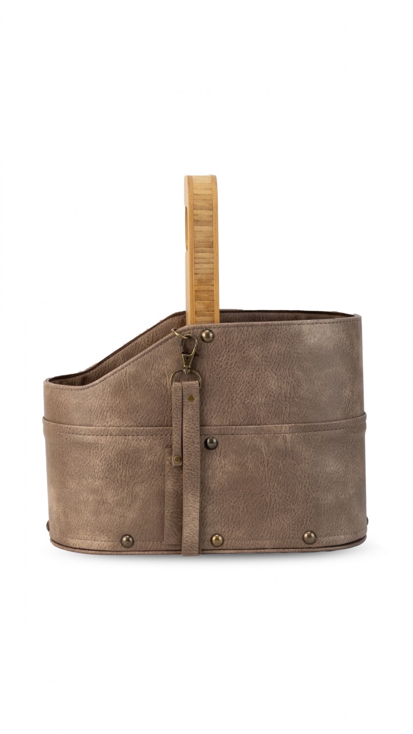 Posa termo con asa de madera. Forrado en símil cuero con detalle de llavero y tachas. Ideal para llevar termo y mate en el auto.