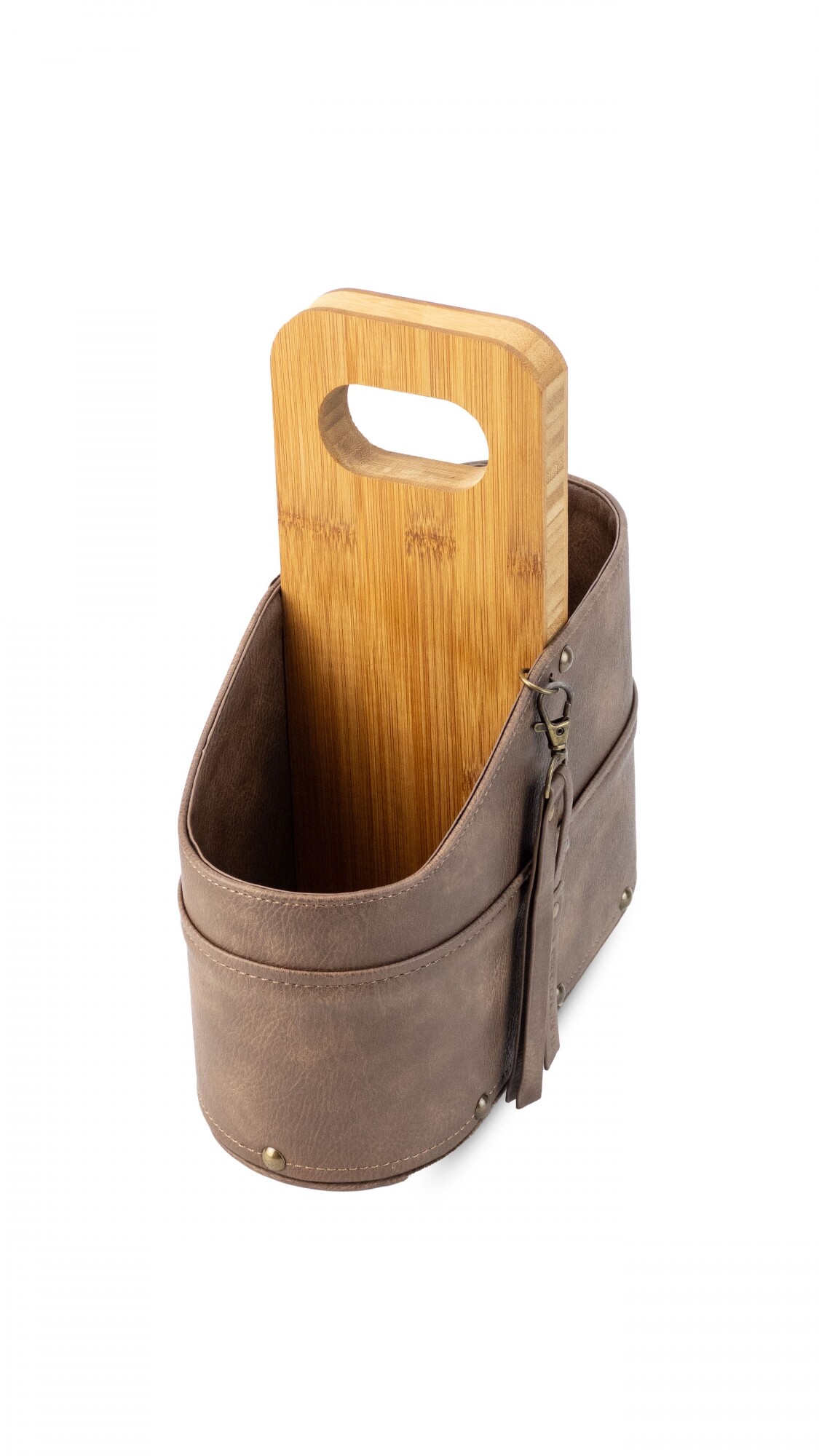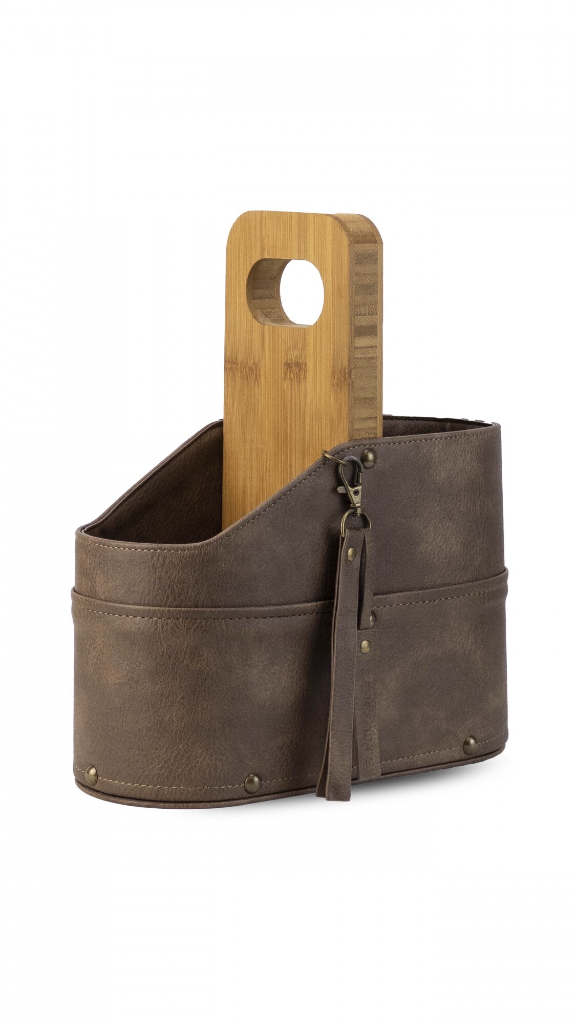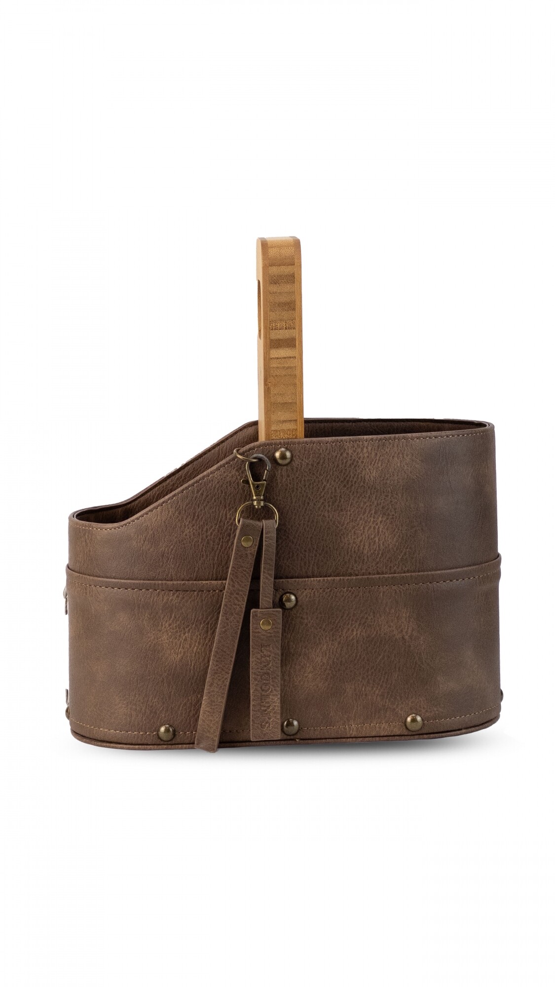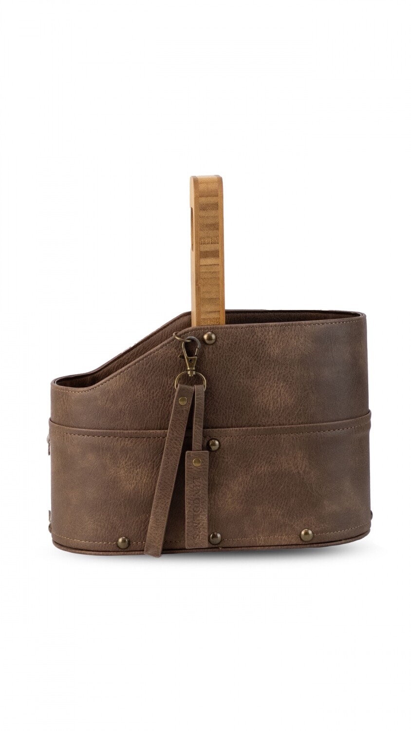 Posa termo con asa de madera. Forrado en símil cuero con detalle de llavero y tachas. Ideal para llevar termo y mate en el auto.