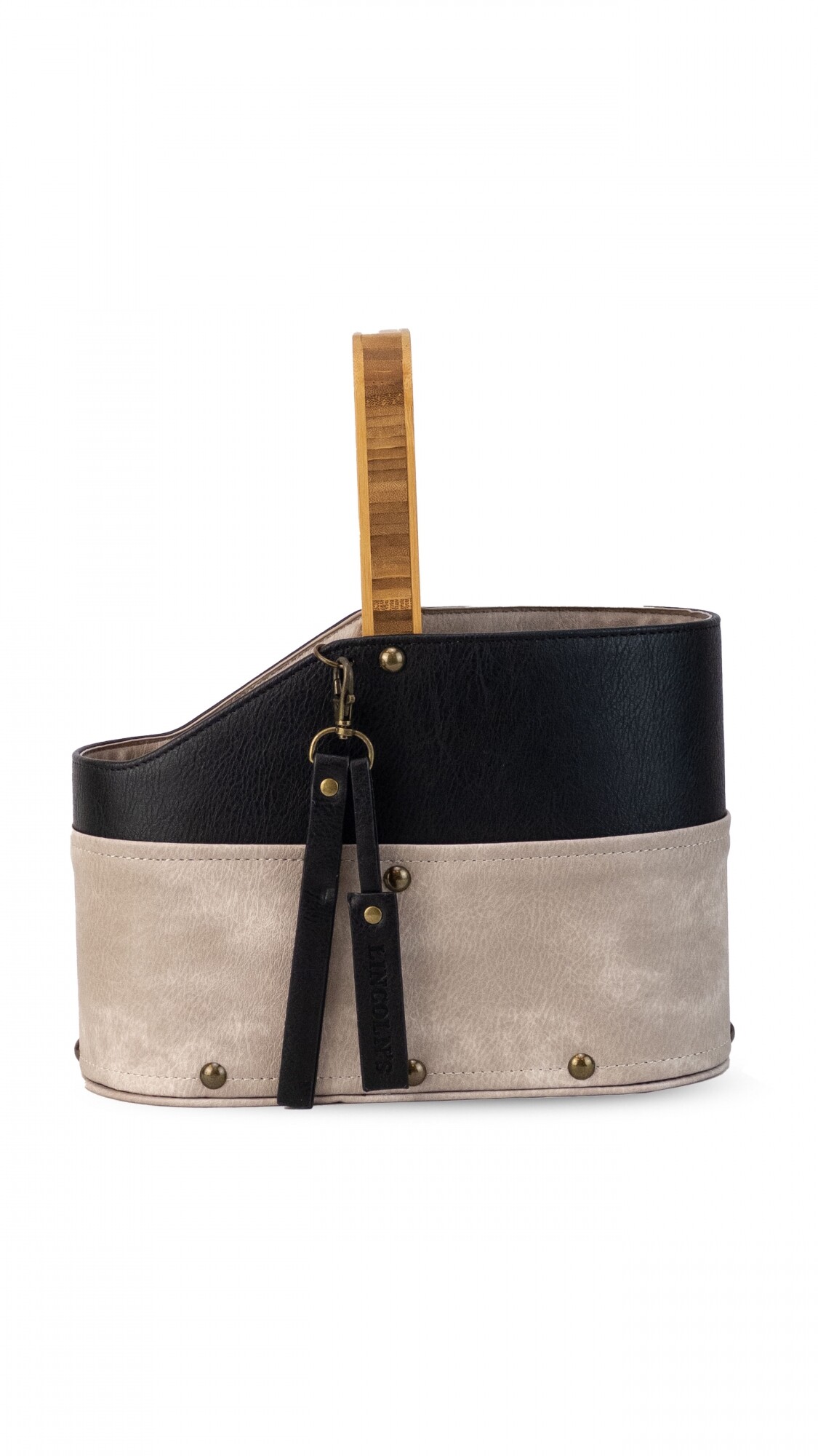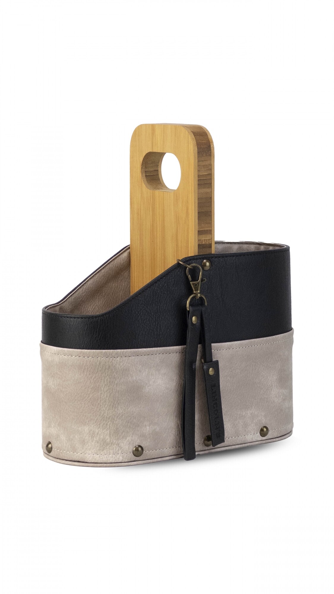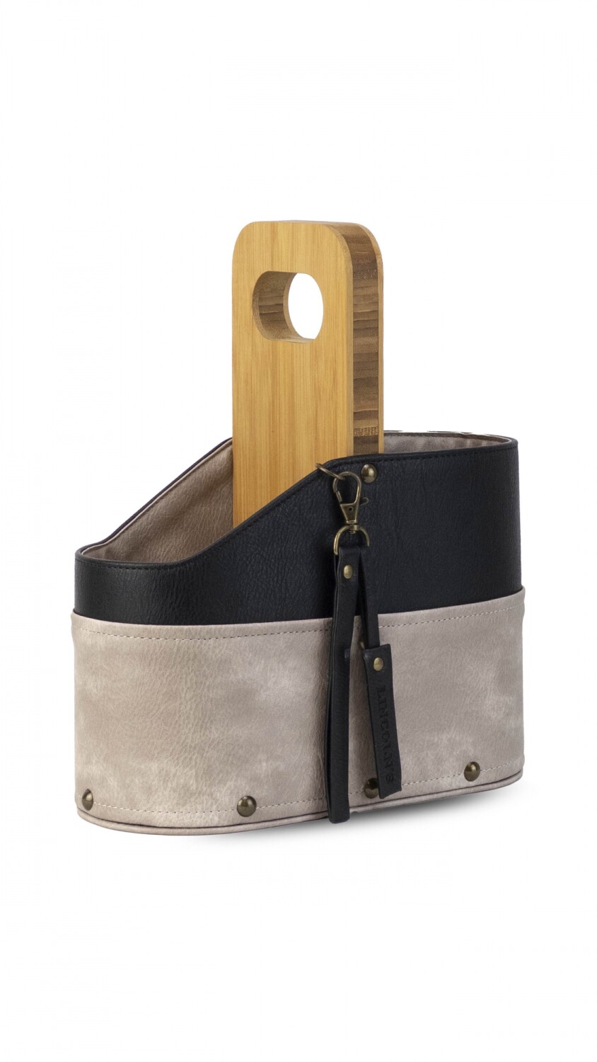 Posa termo con asa de madera. Forrado en símil cuero con detalle de llavero y tachas. Ideal para llevar termo y mate en el auto.