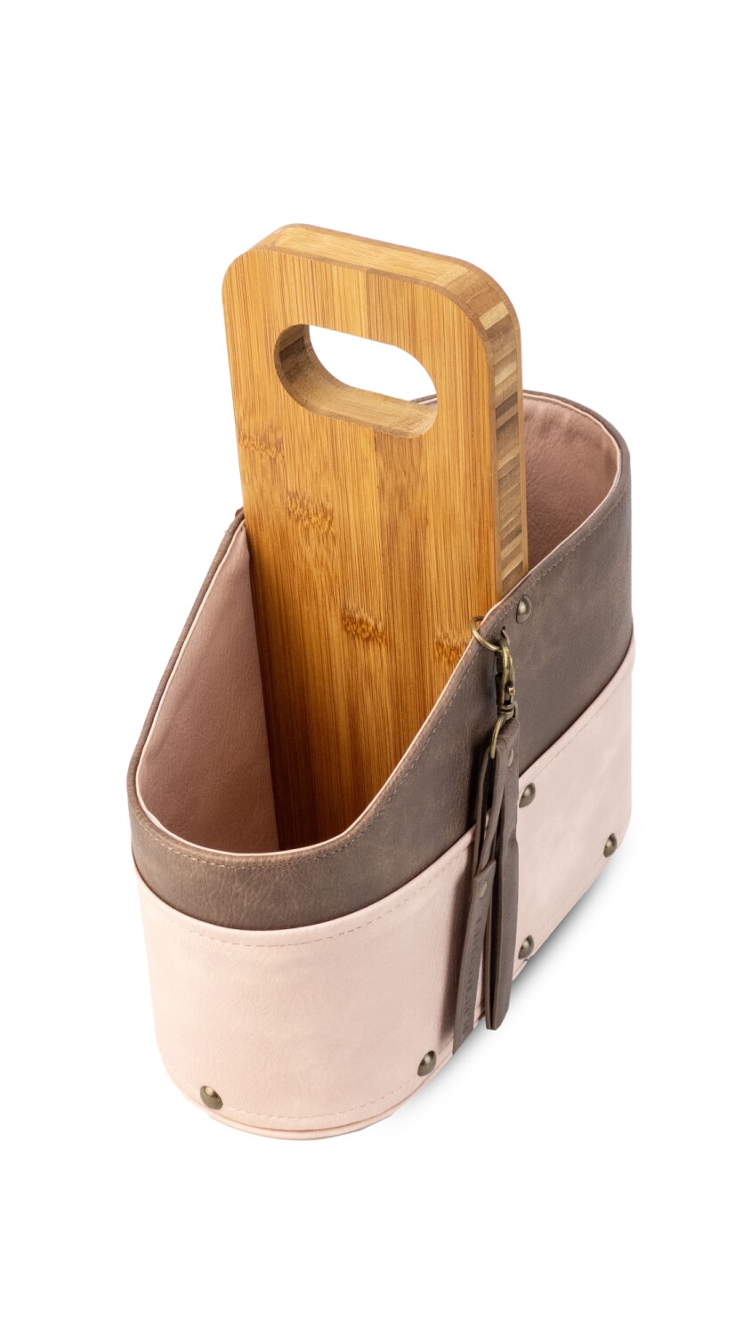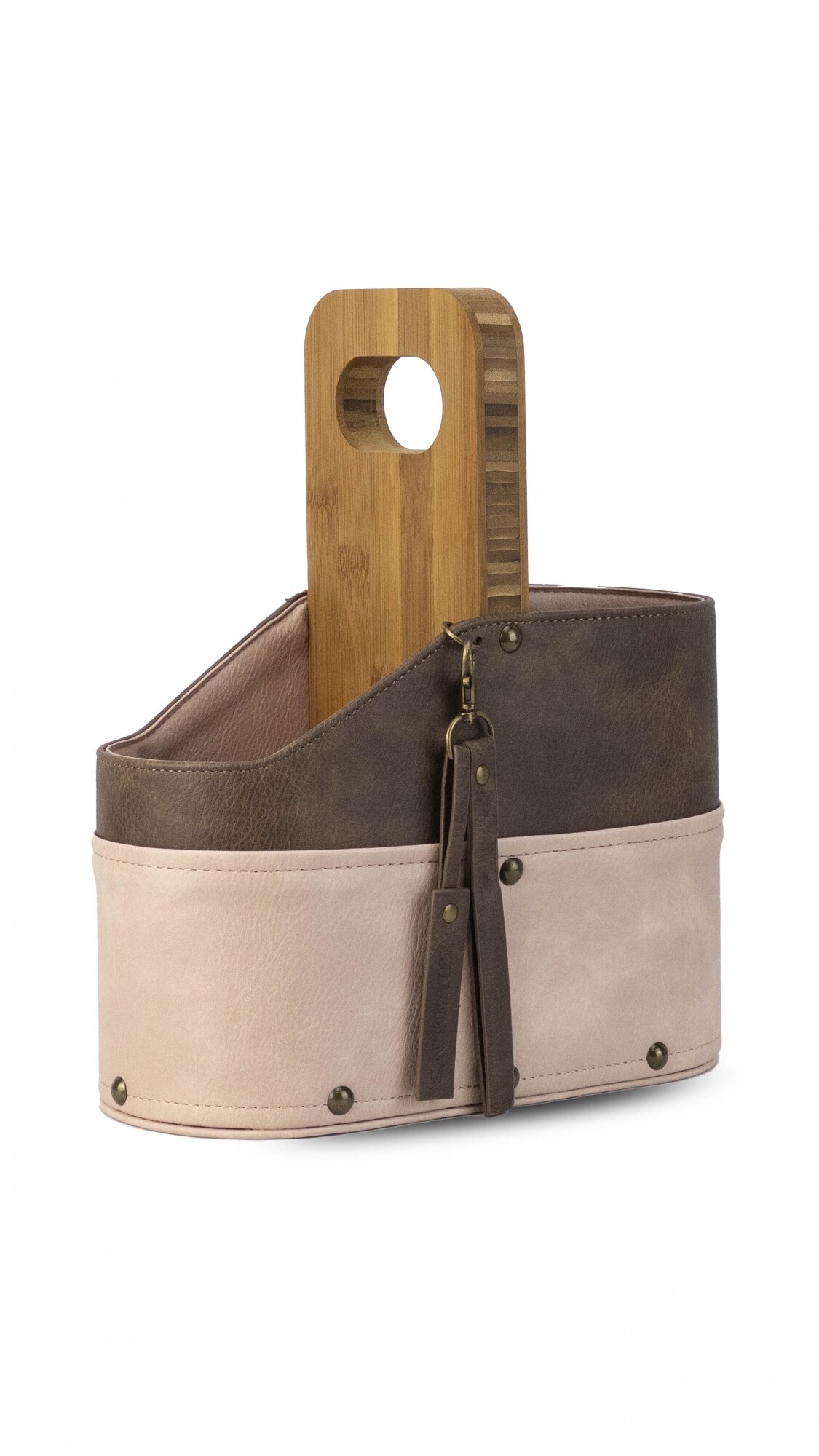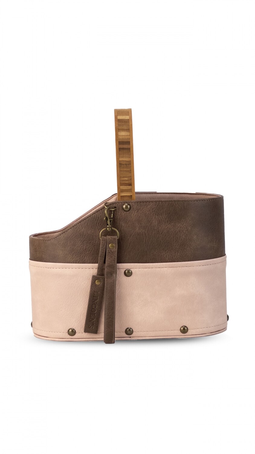 Posa termo con asa de madera. Forrado en símil cuero con detalle de llavero y tachas. Ideal para llevar termo y mate en el auto.