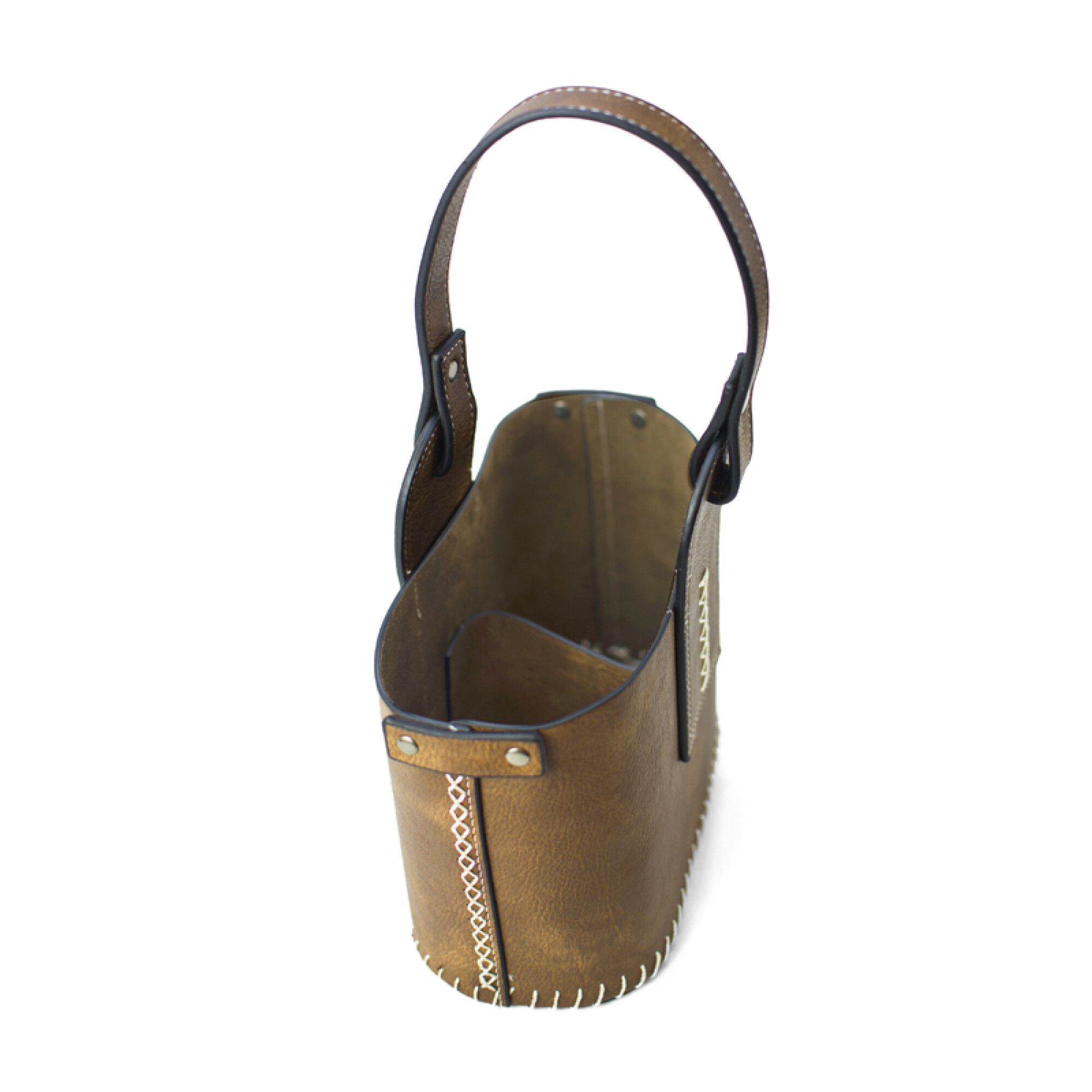 Posa termo En símil cuero con división al medio y asa fija de mano reforzada.
