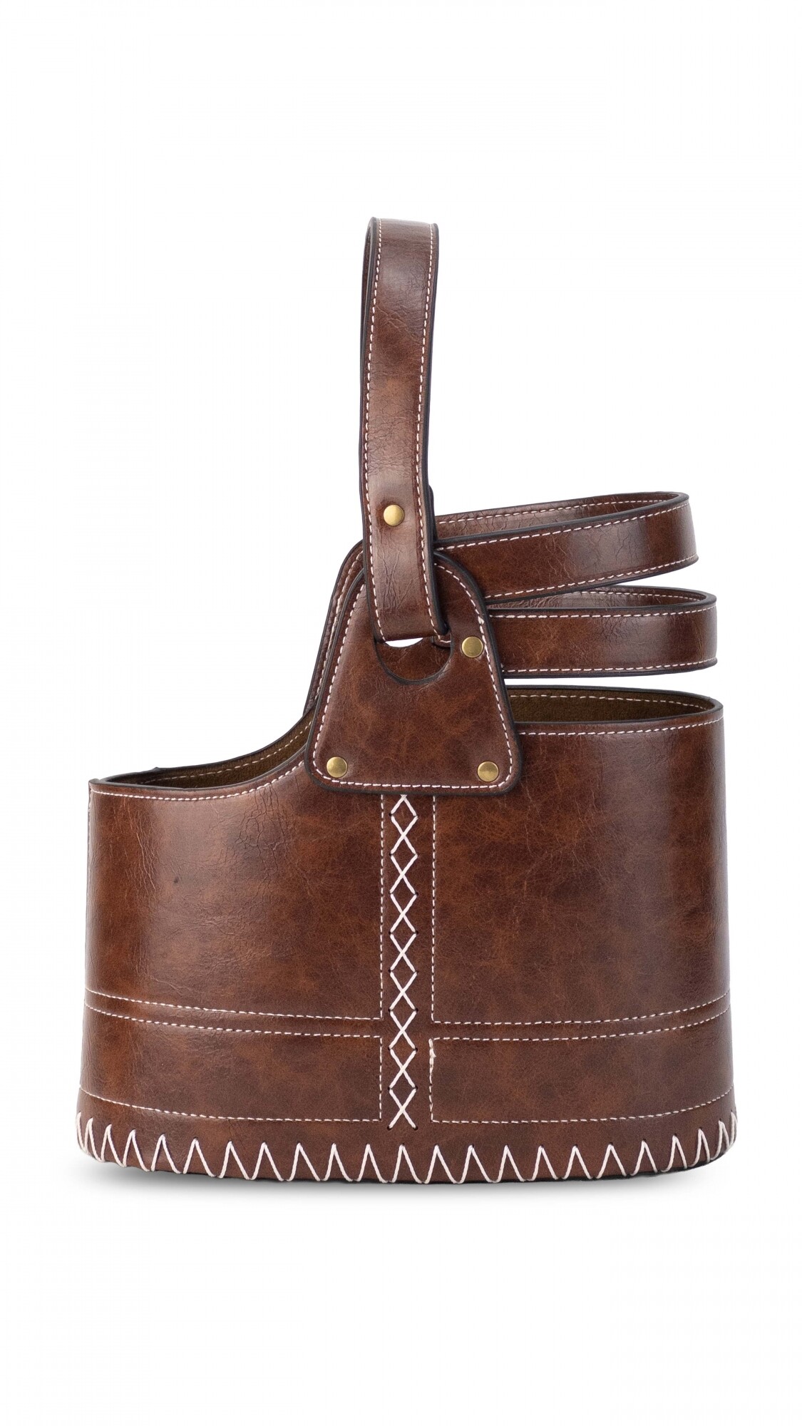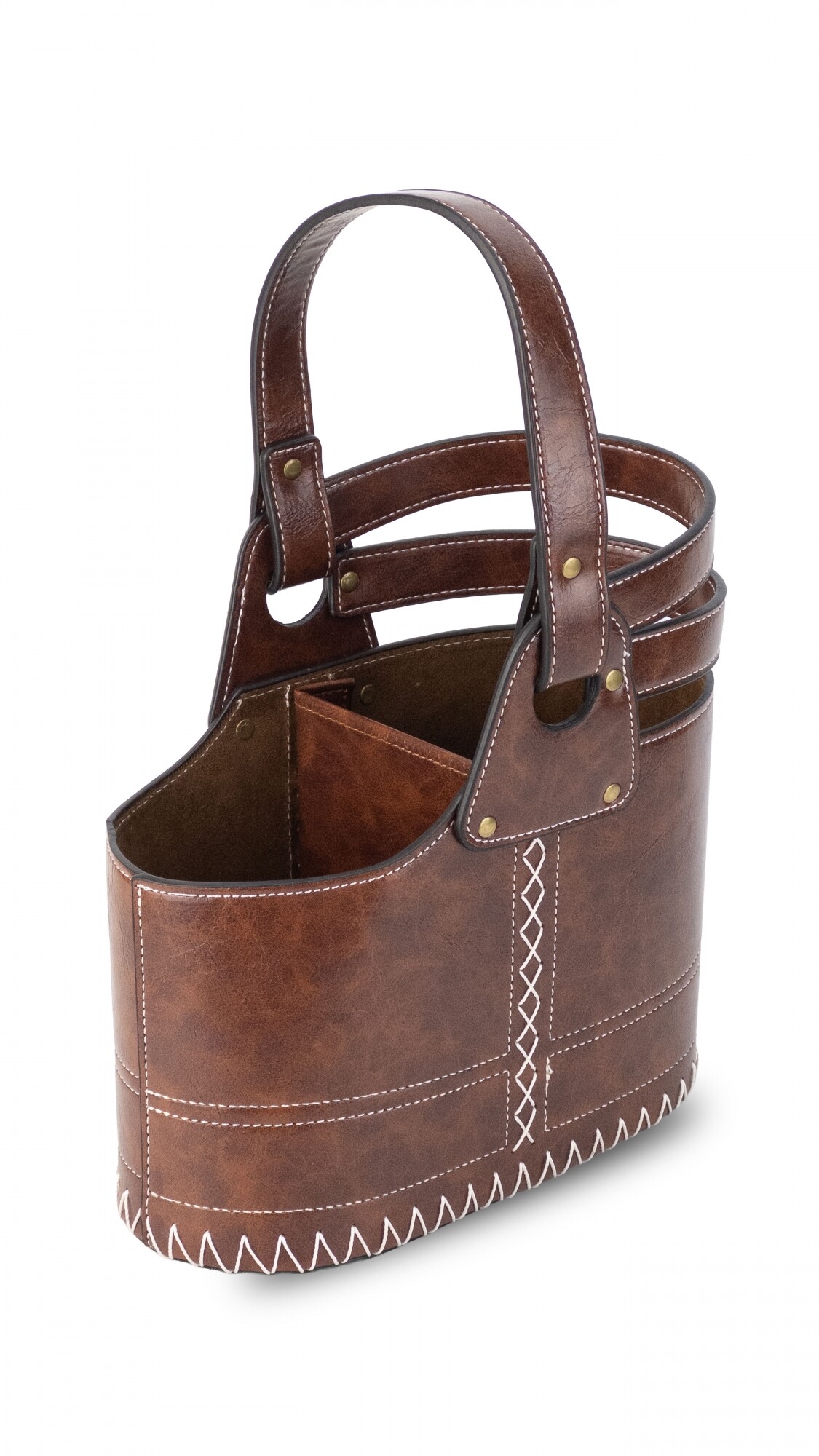 Posa termo en símil cuero con división al medio de excelente terminación. Manijas reforzadas y costuras decorativas que aportan estilo.