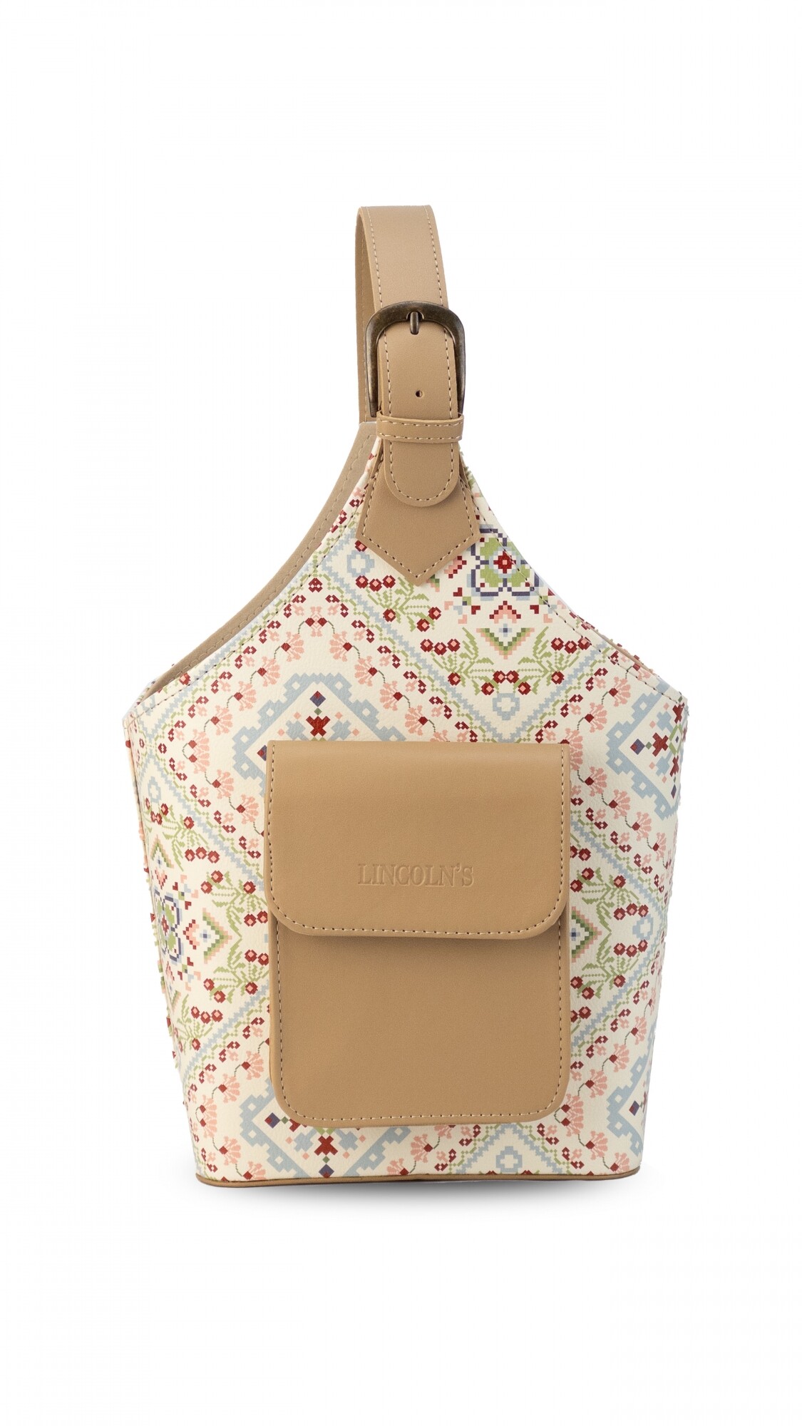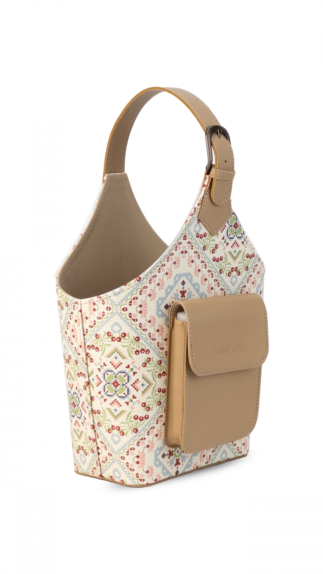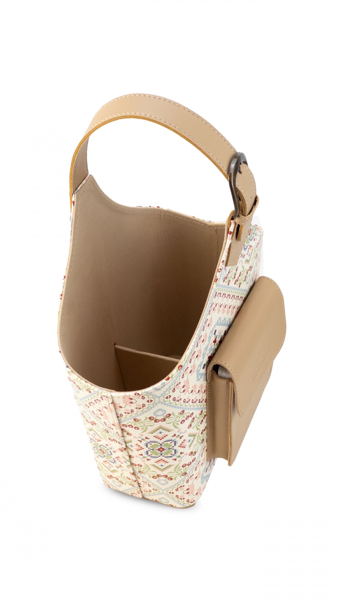 Posa termo en símil cuero con división al medio y asa de mano regulable con presilla. Bolsillo al frente con imán