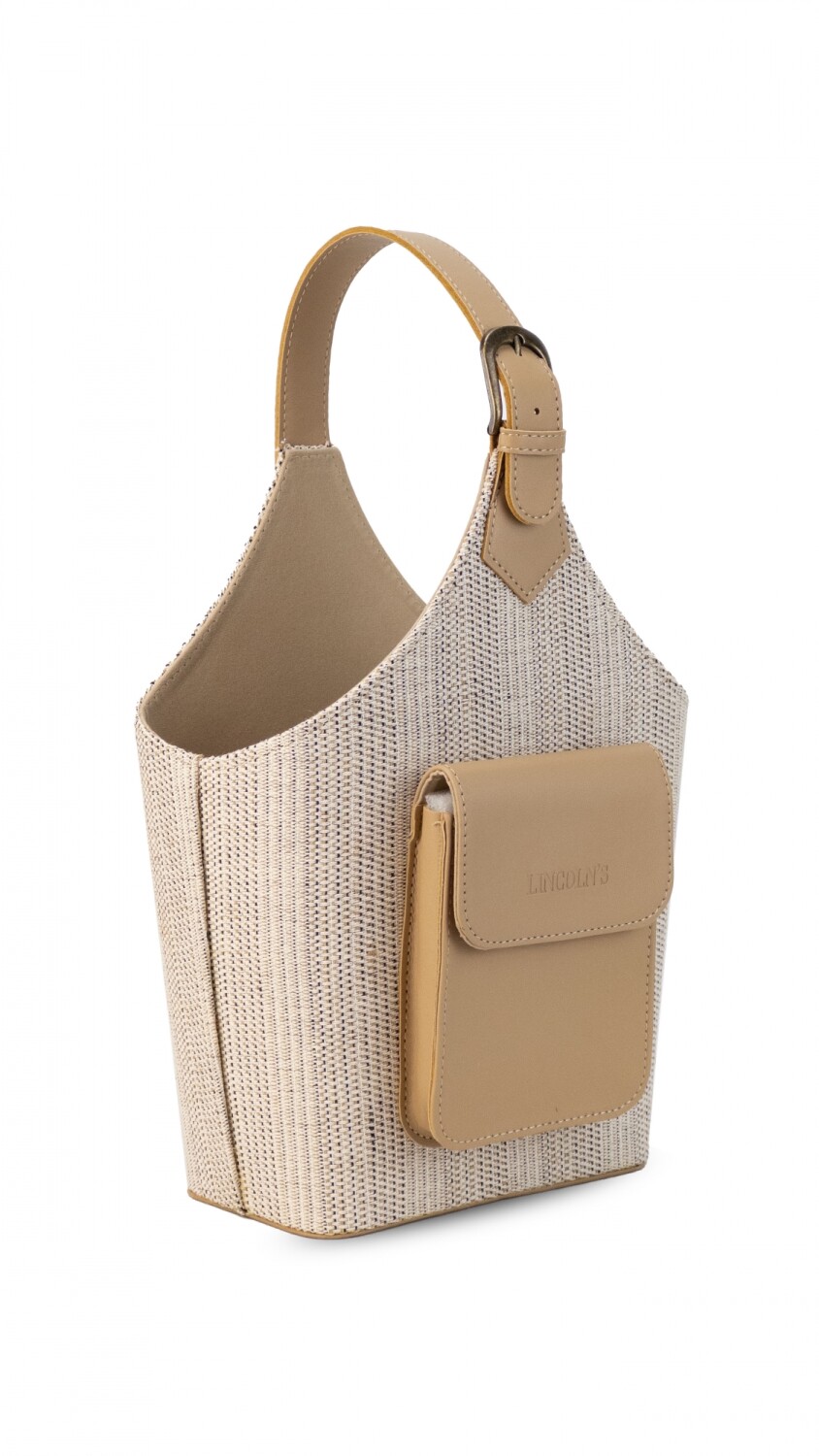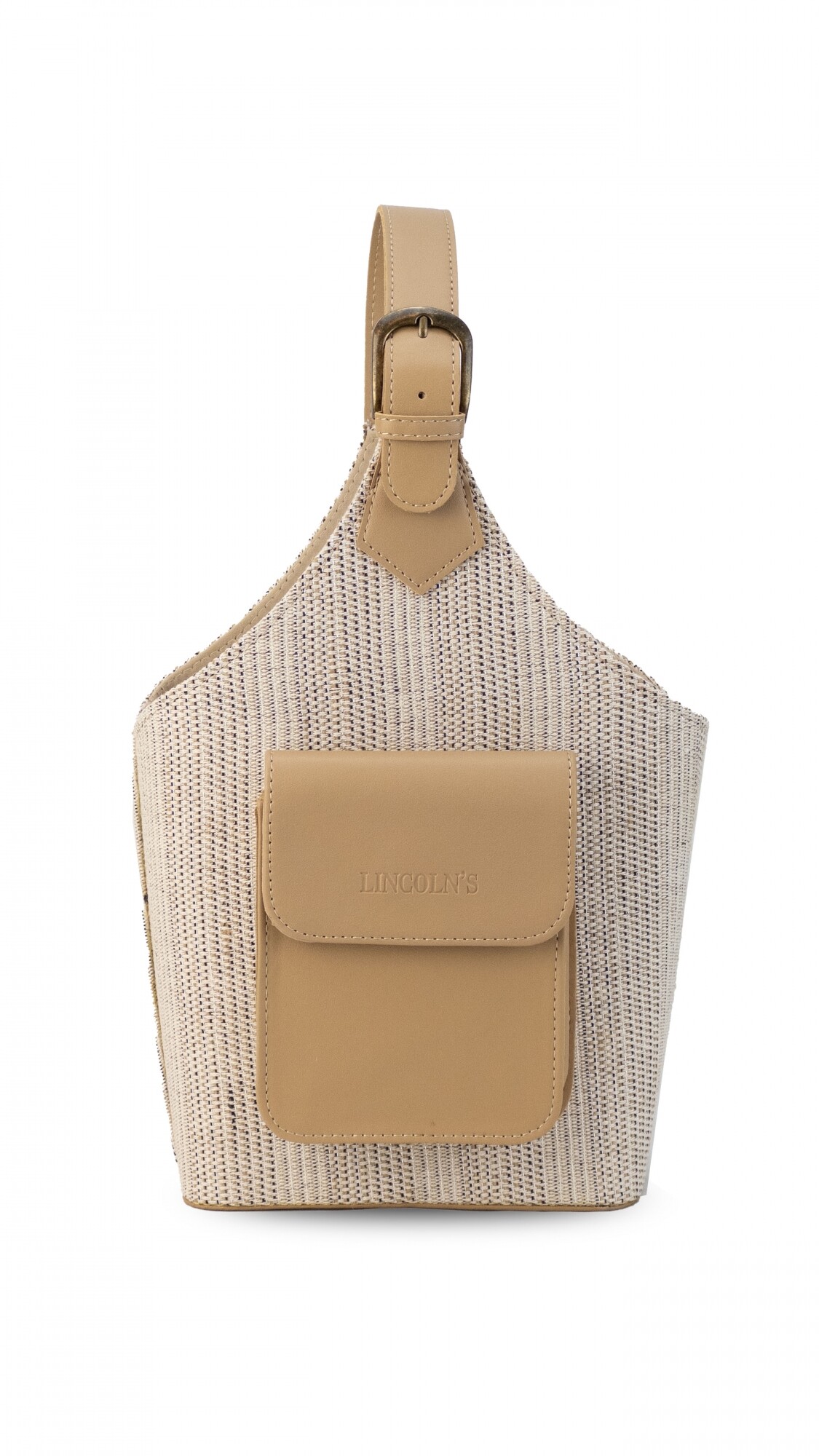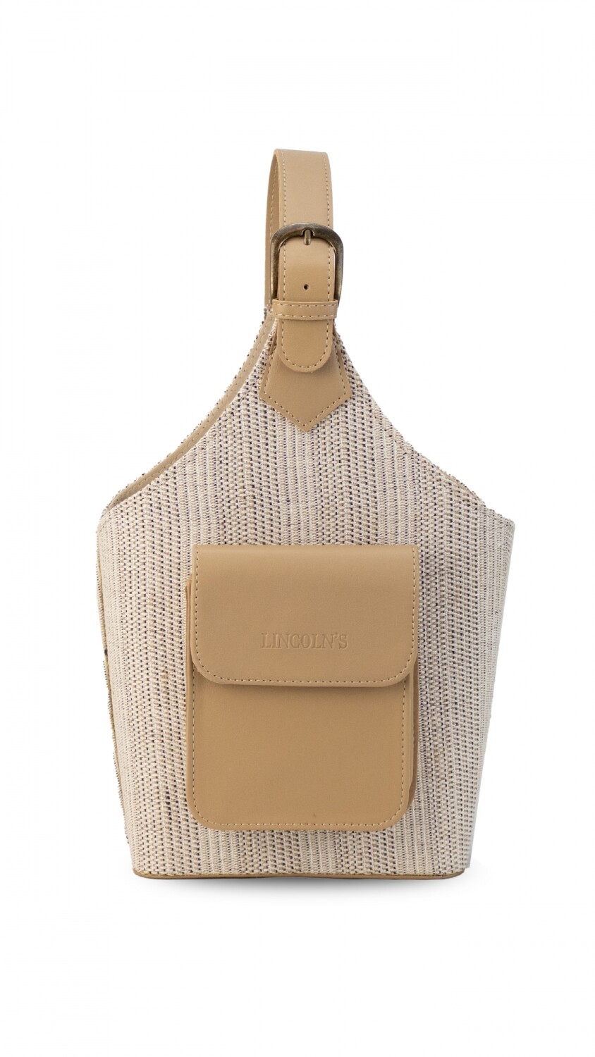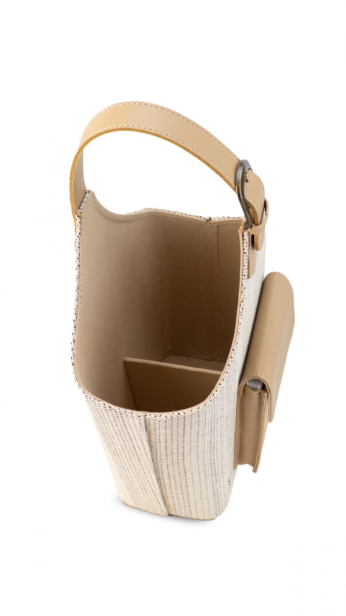 Posa termo en símil cuero con división al medio y asa de mano regulable con presilla. Bolsillo al frente con imán