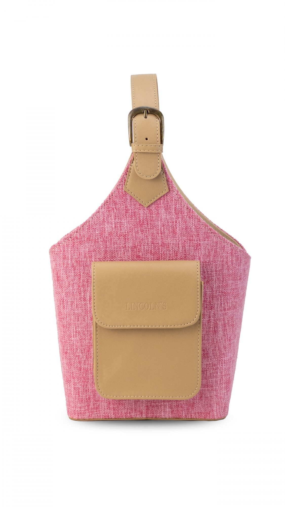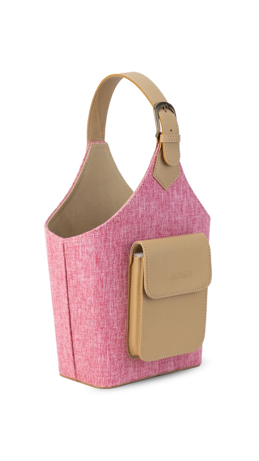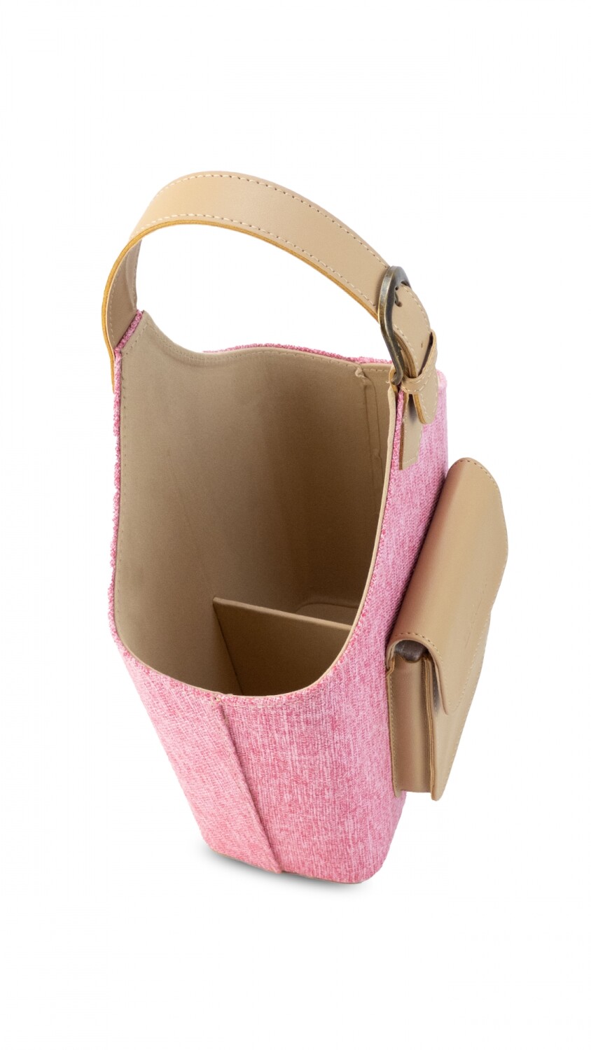 Posa termo en símil cuero con división al medio y asa de mano regulable con presilla. Bolsillo al frente con imán