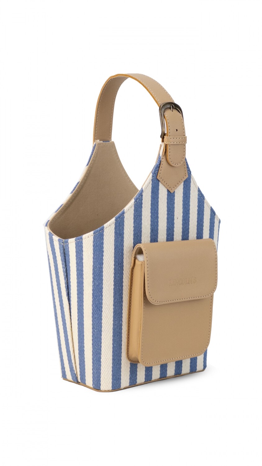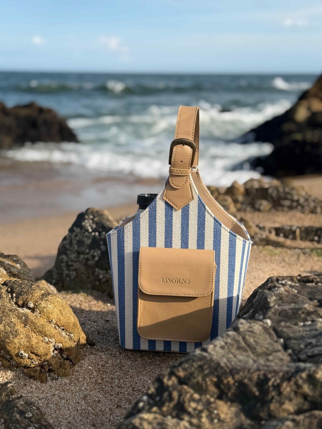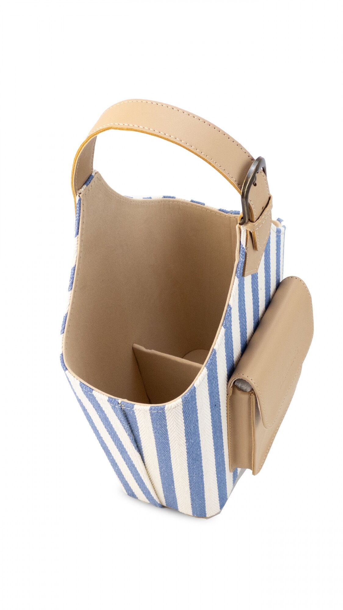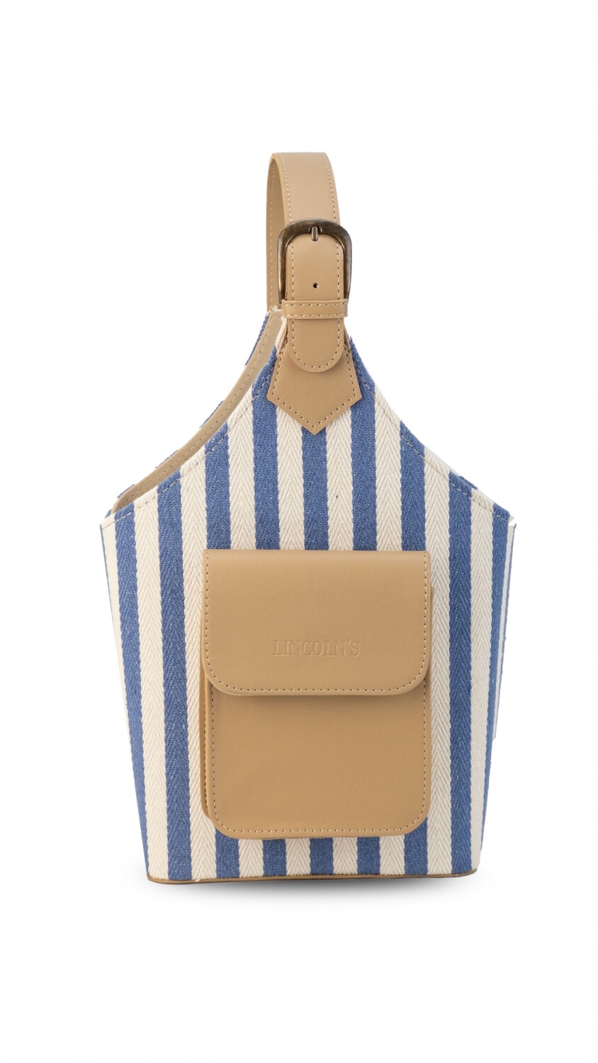 Posa termo en símil cuero con división al medio y asa de mano regulable con presilla. Bolsillo al frente con imán