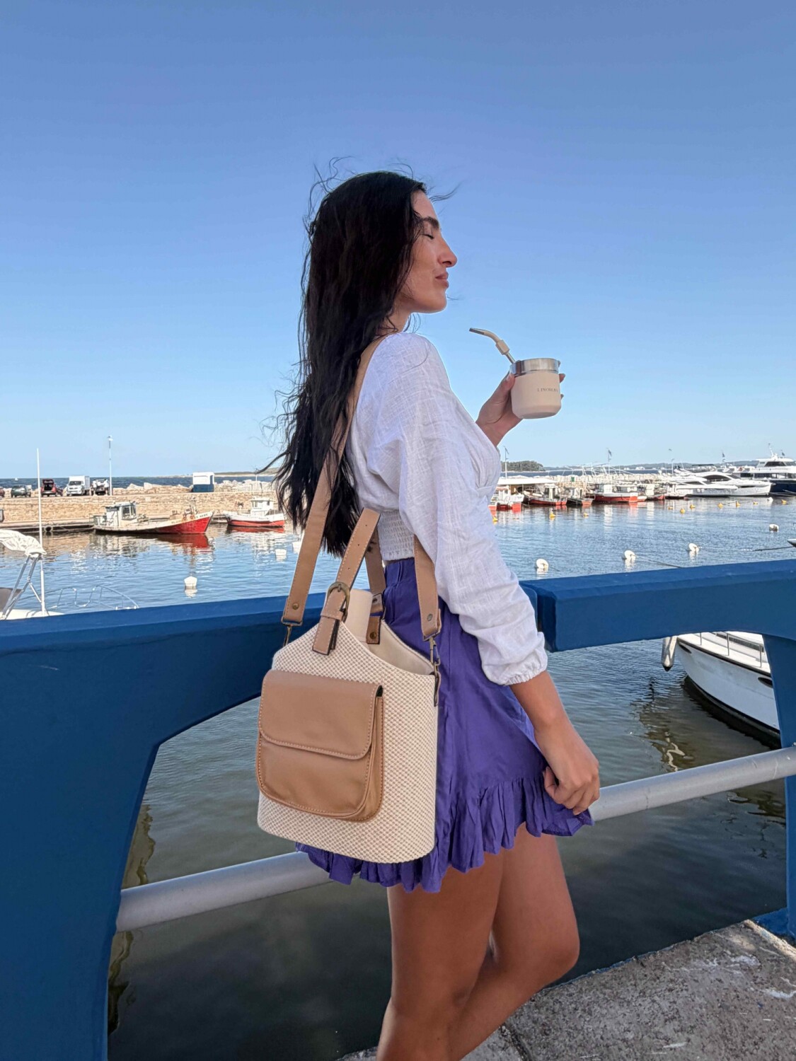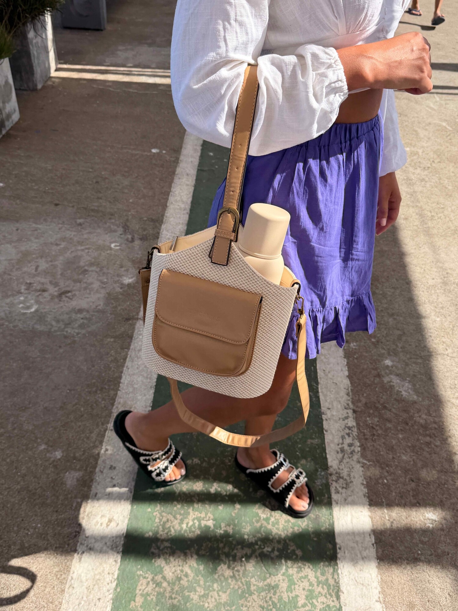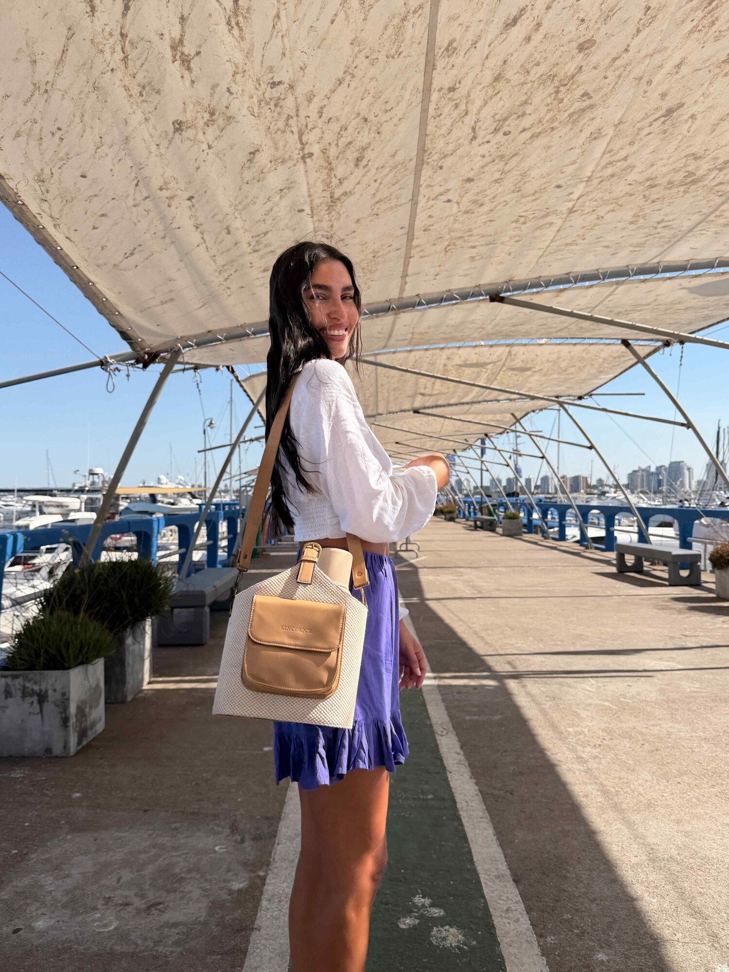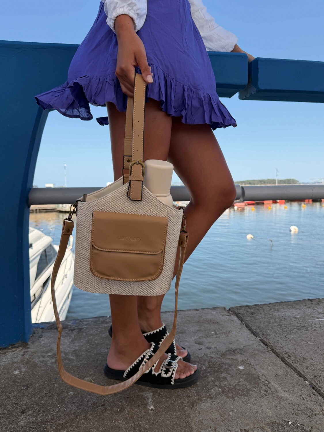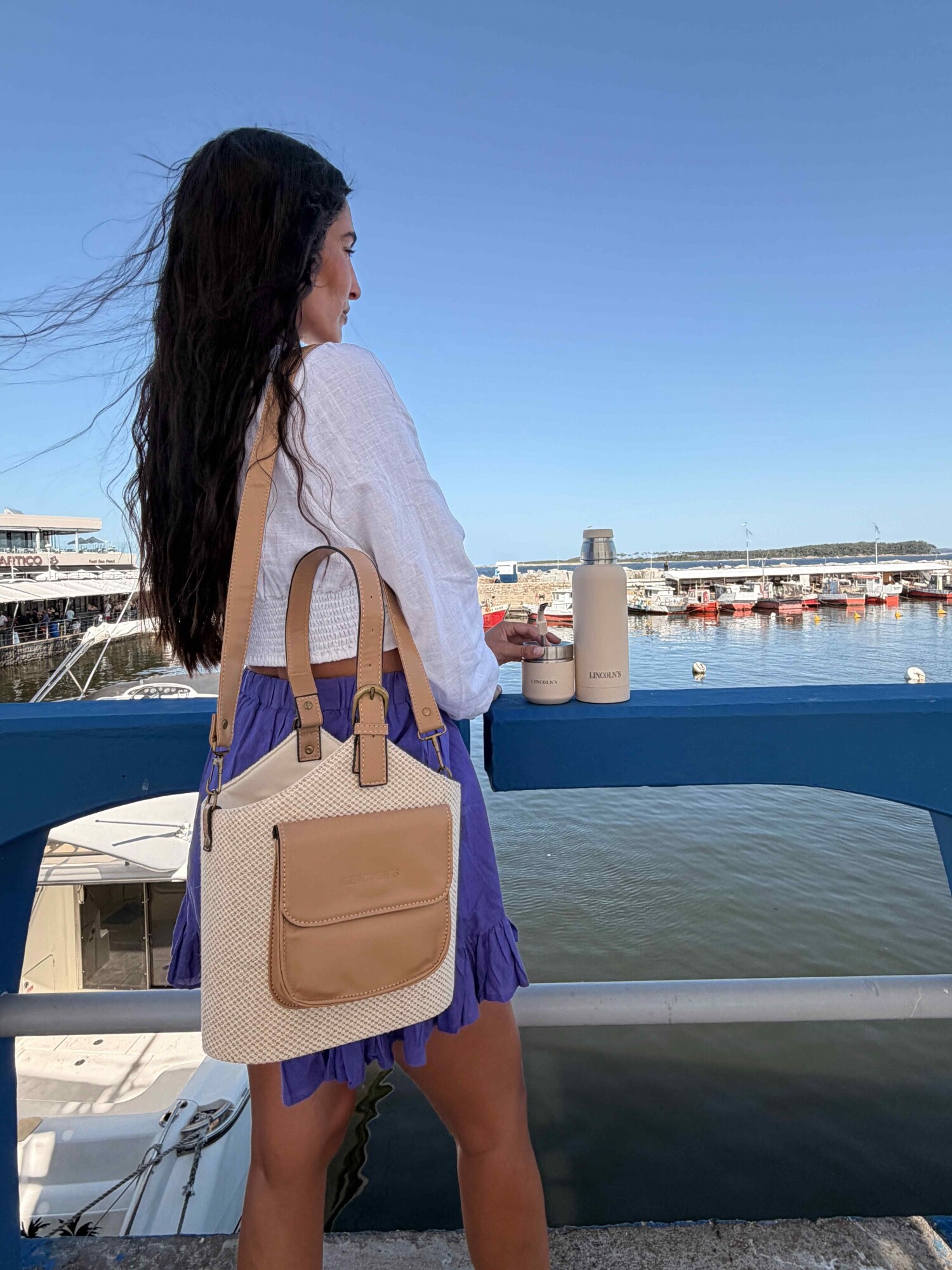 - Posa termo con bolsillo al frente. División interna con asa de mano y cuenta con asa larga desmontable.