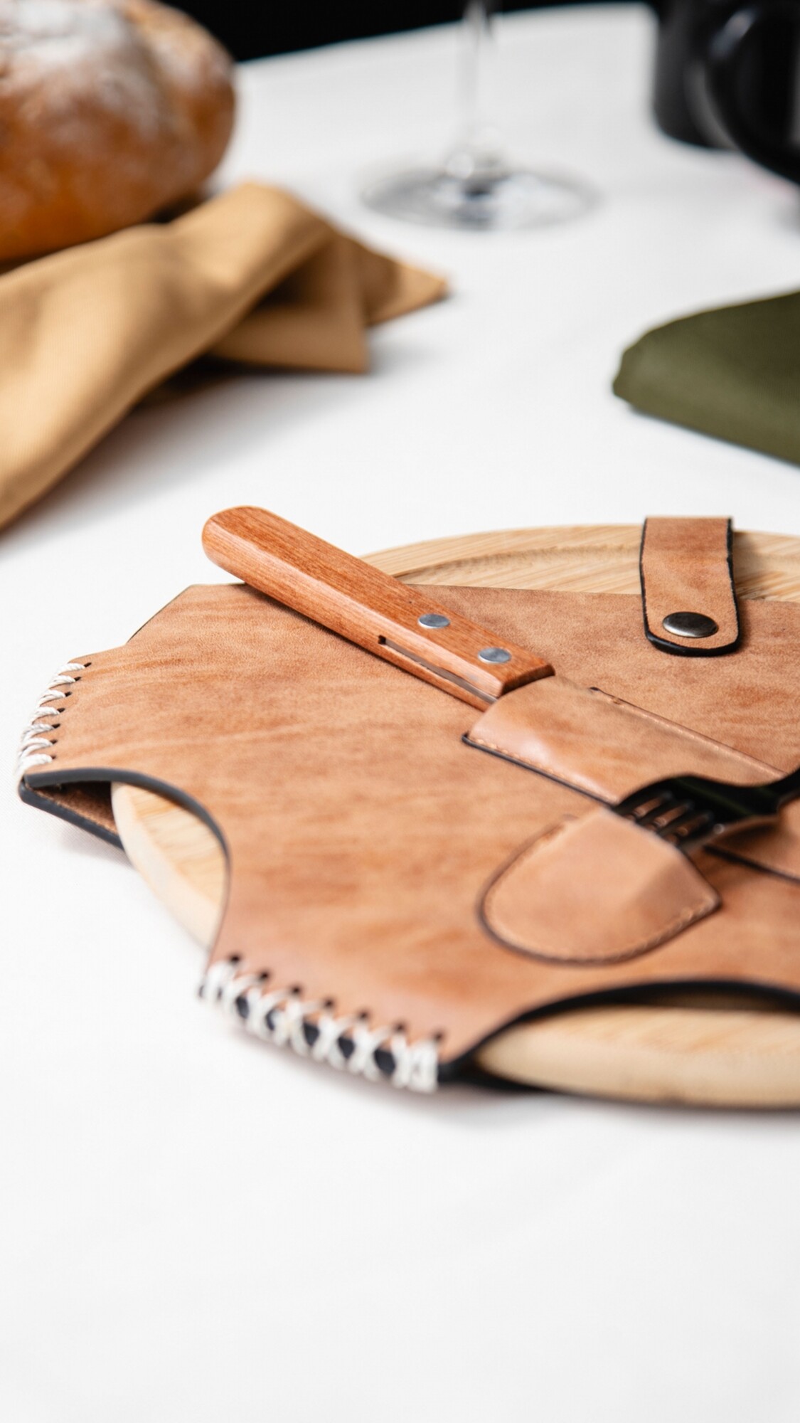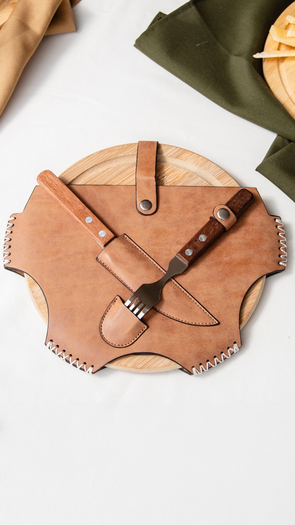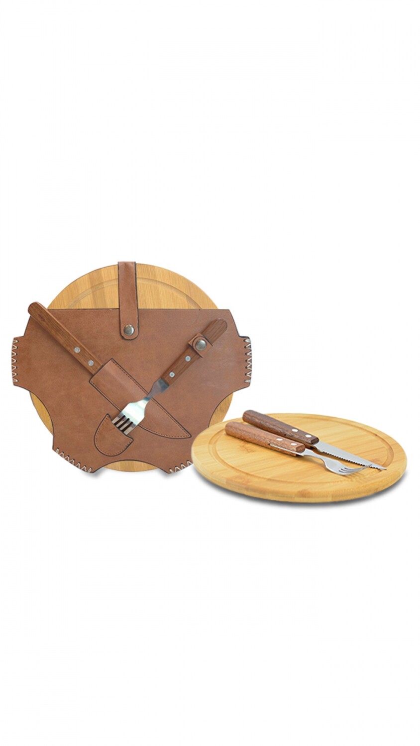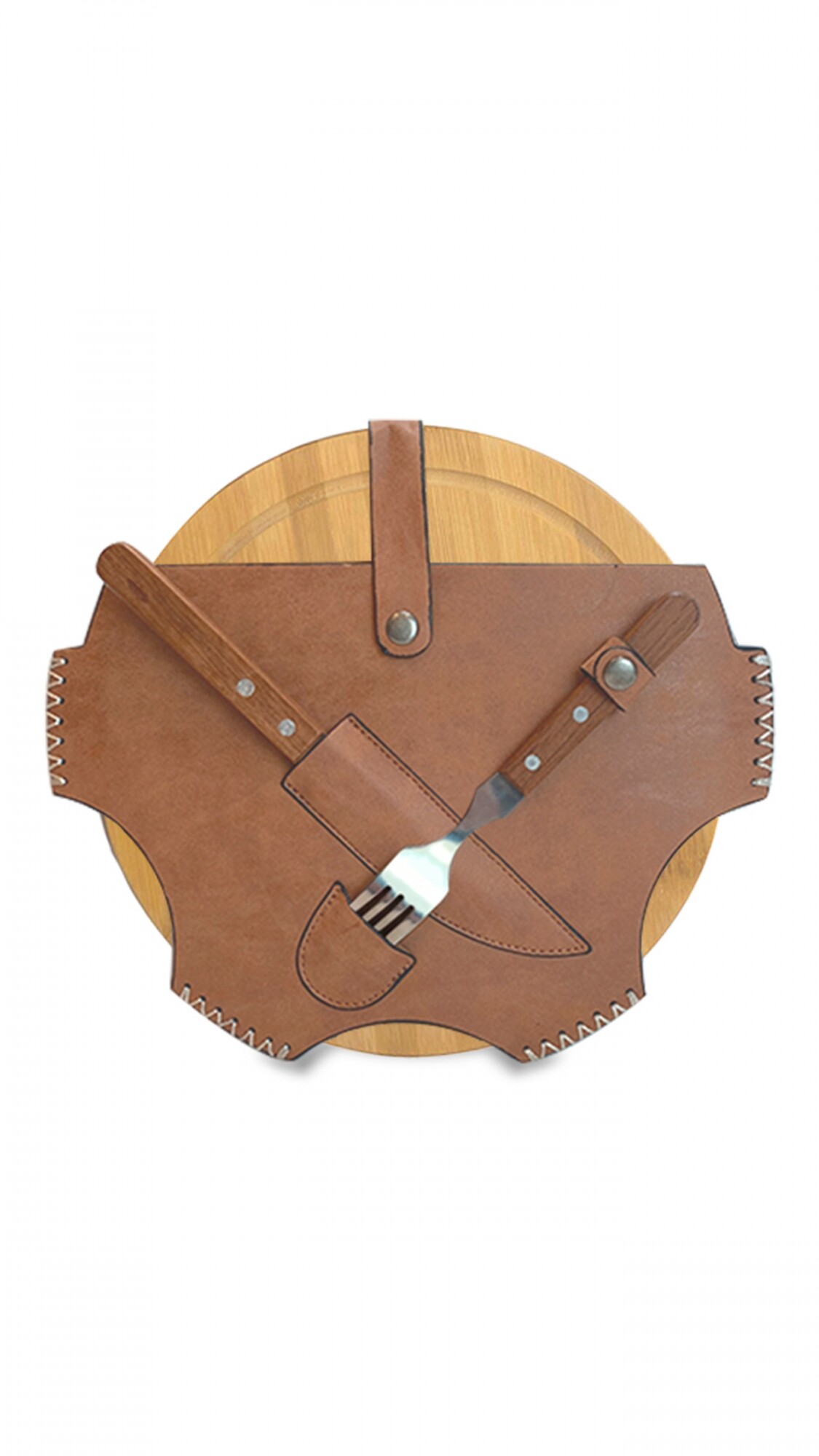 Tabla para parrilla de bamboo redonda, con estuche semi abierto en símil cuero y juego de cubiertos.