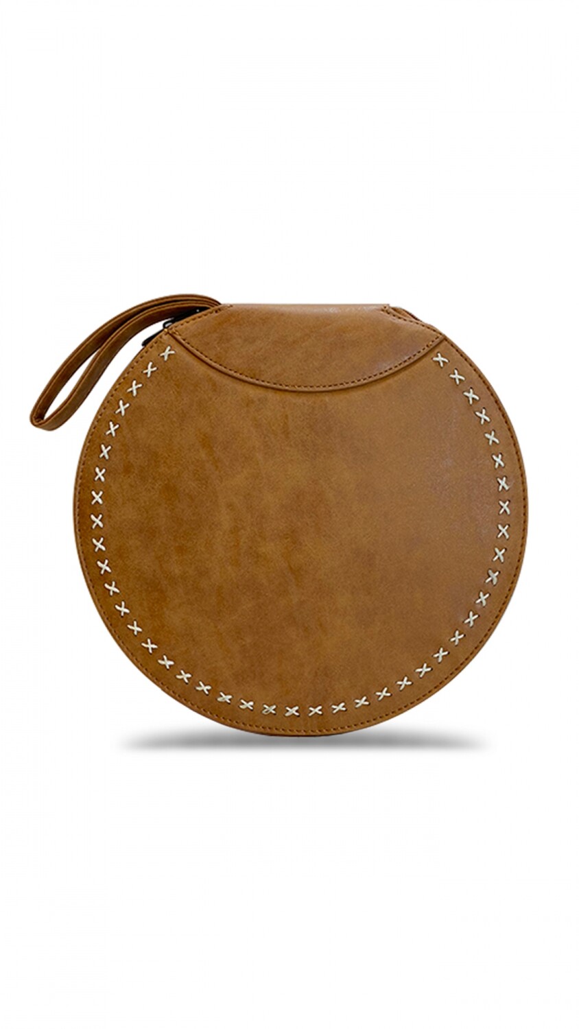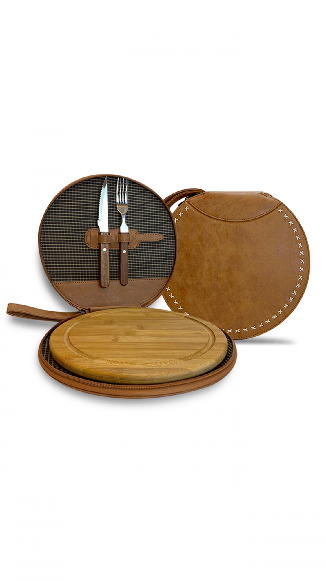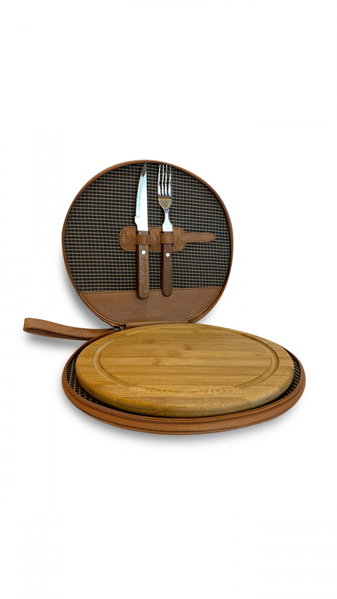 Set parrillero redondo simple con cierre y detalle costura artesanal. Incluye una tabla redonda de bamboo y un juego de cubiertos con mango de madera en el interior.