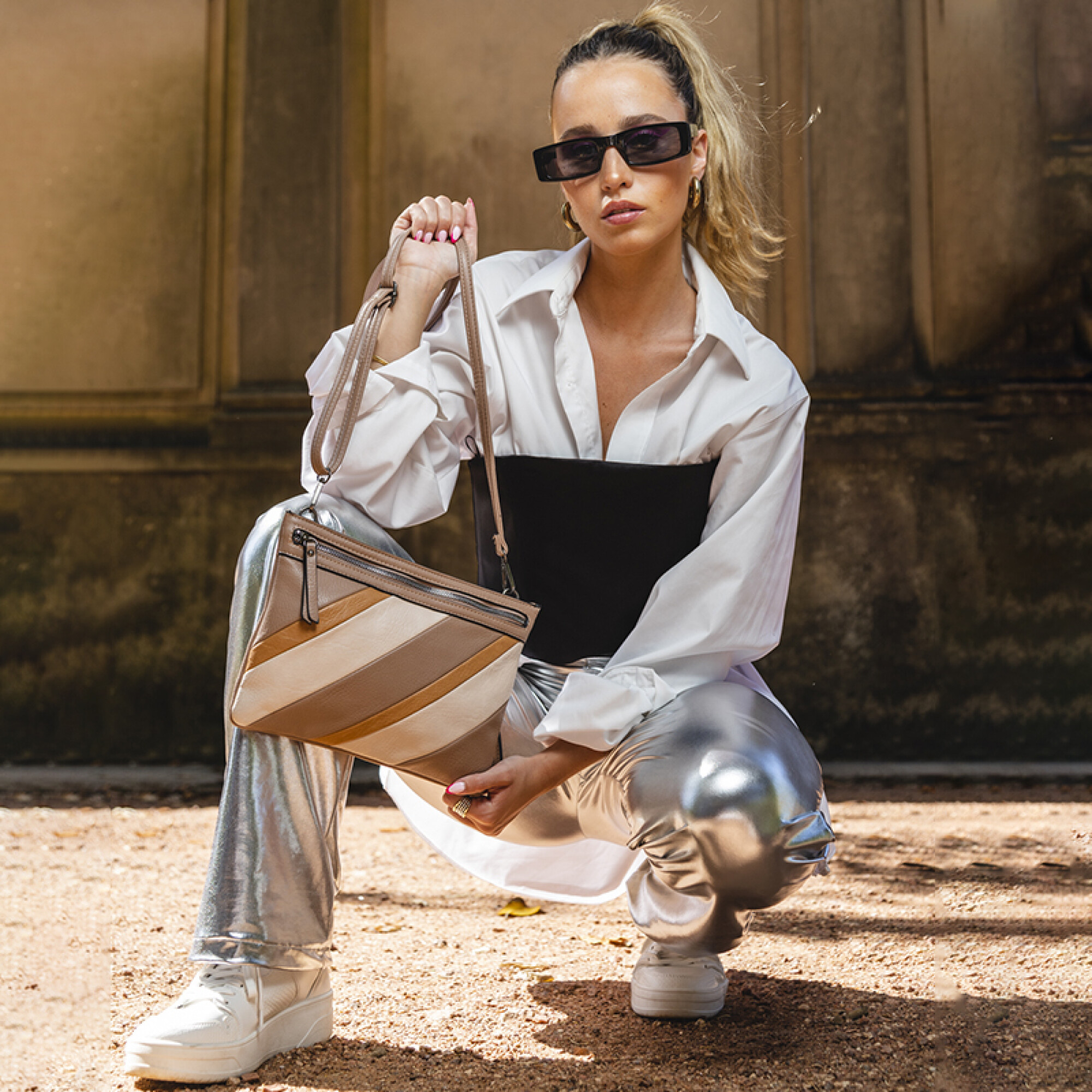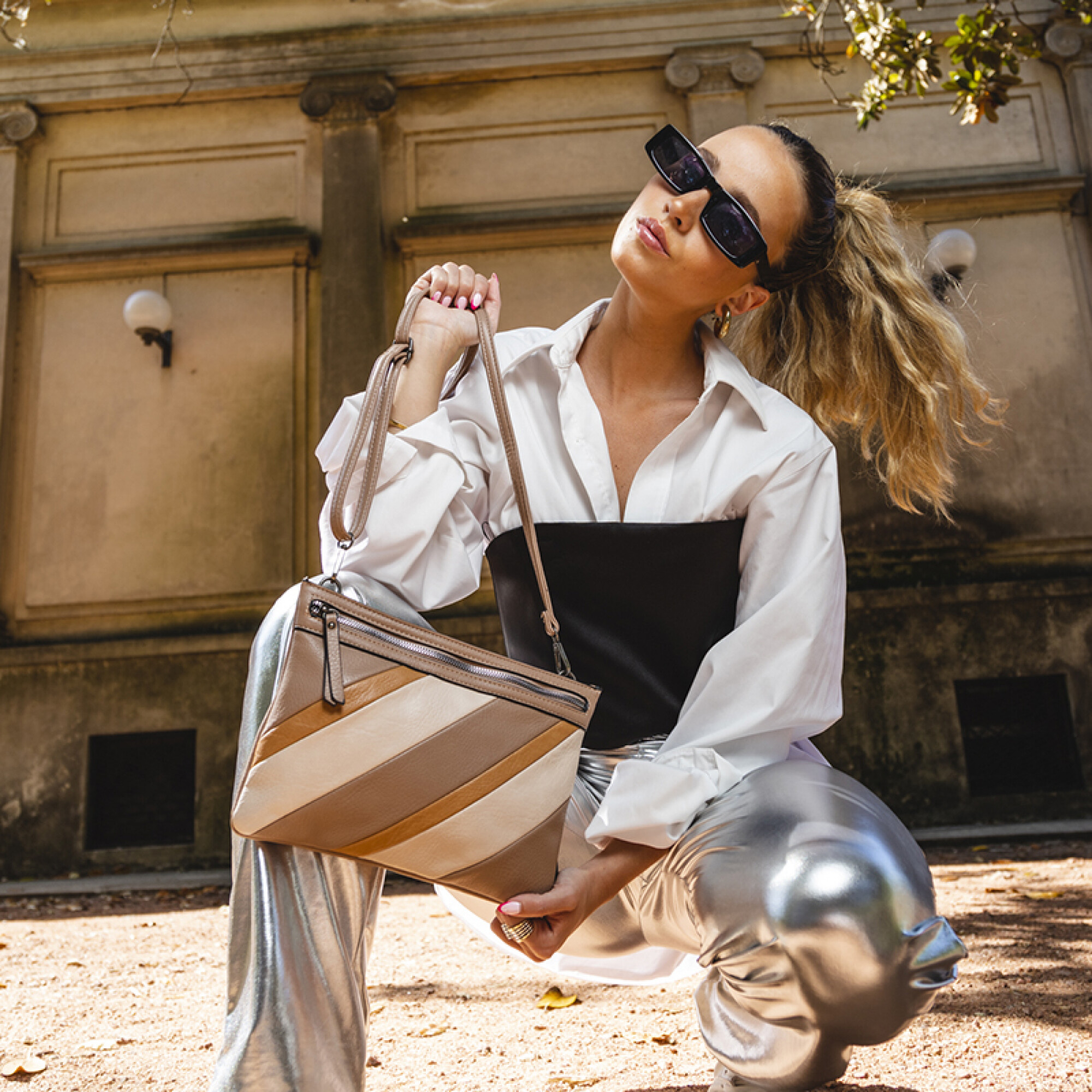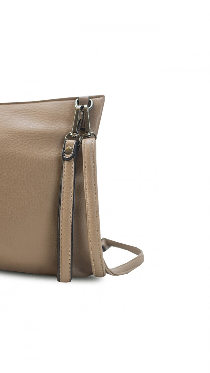 En su interior cuenta con un bolsillo con cierre y otro abierto con división.