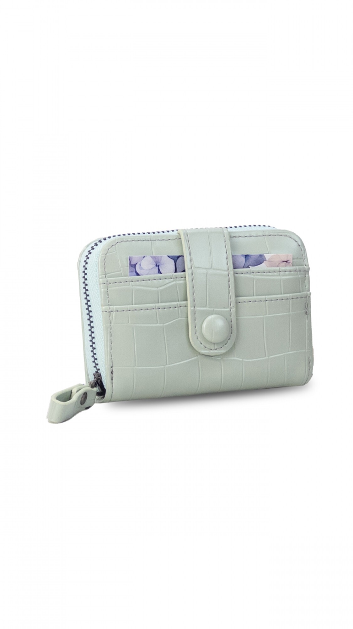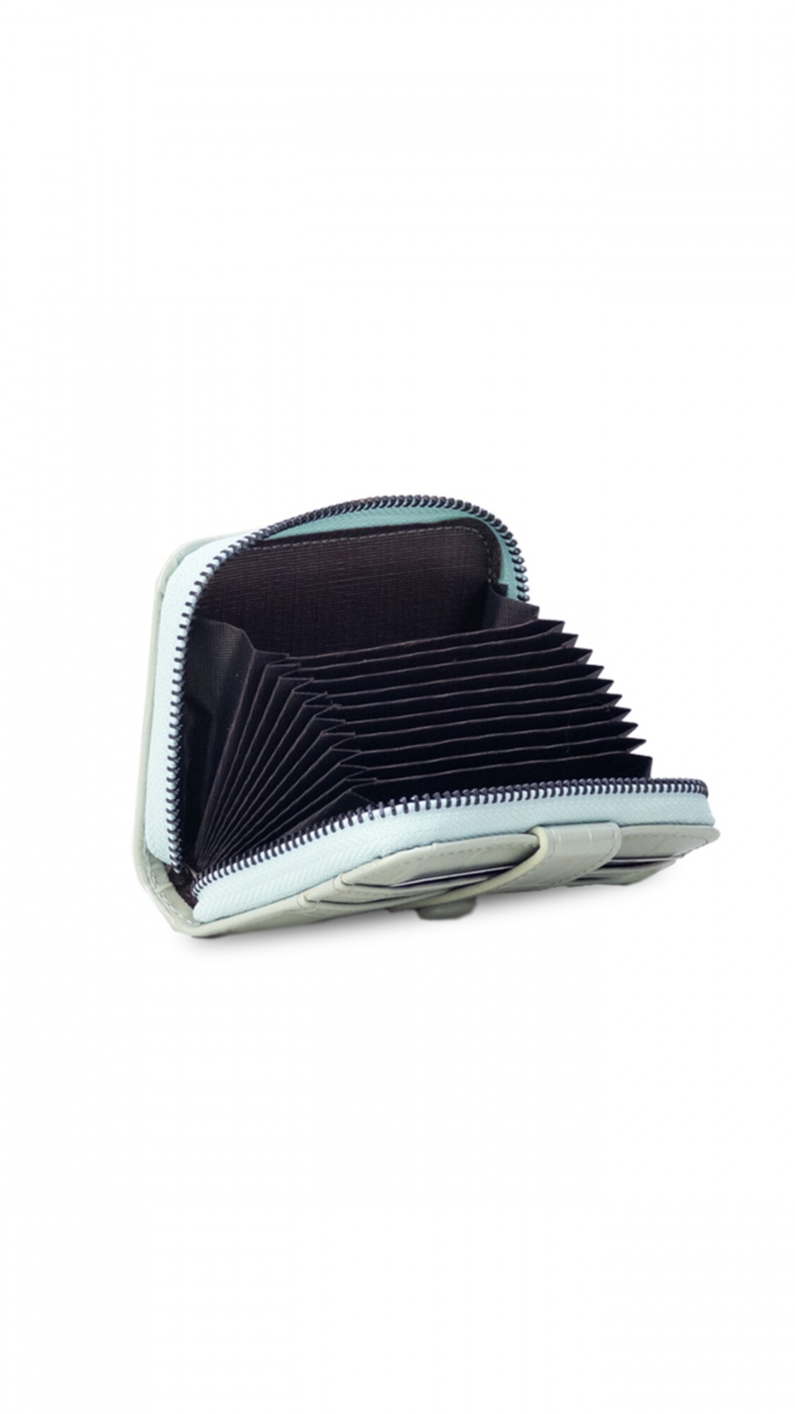 Este tarjetero abanico con cierre ofrece un diseño compacto y funcional, con capacidad para 10 tarjetas.