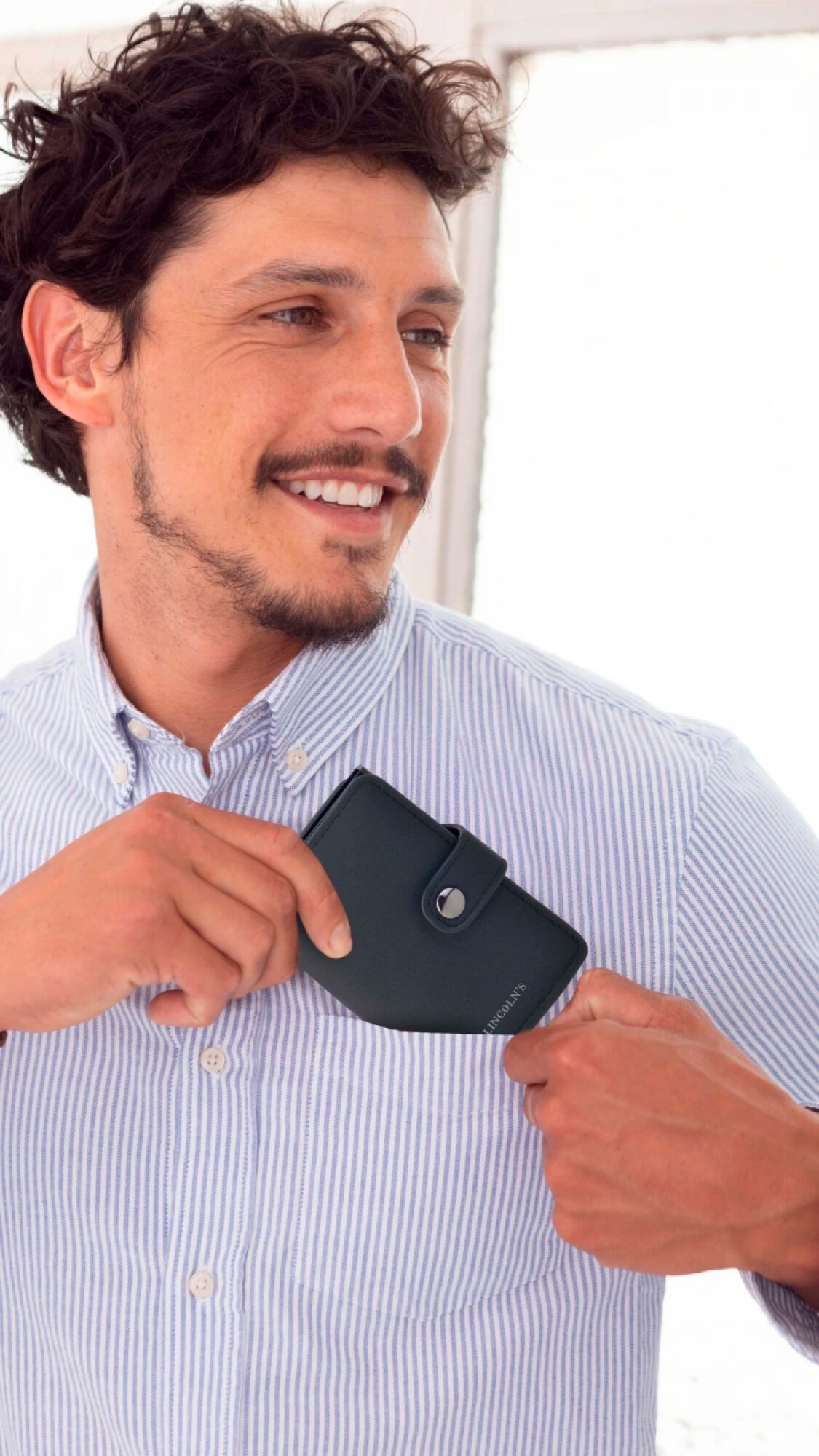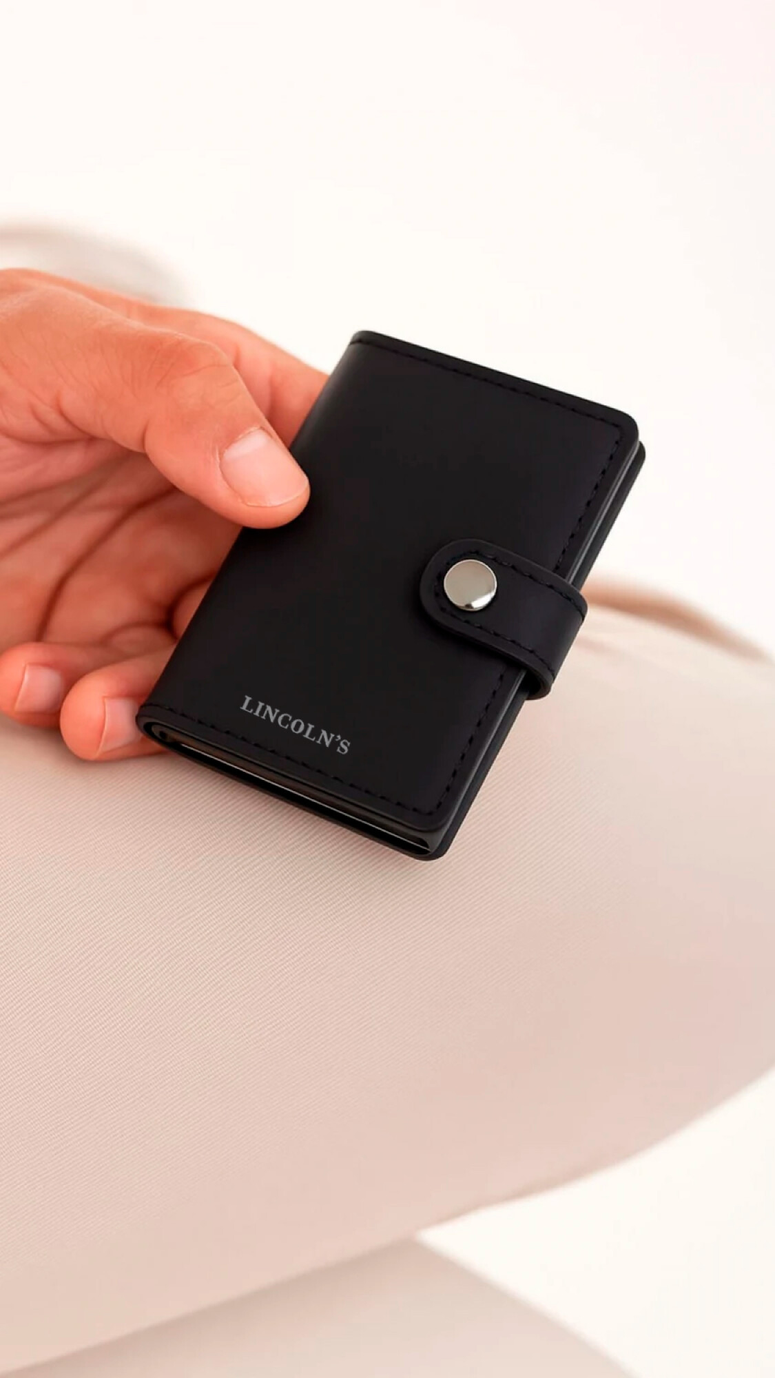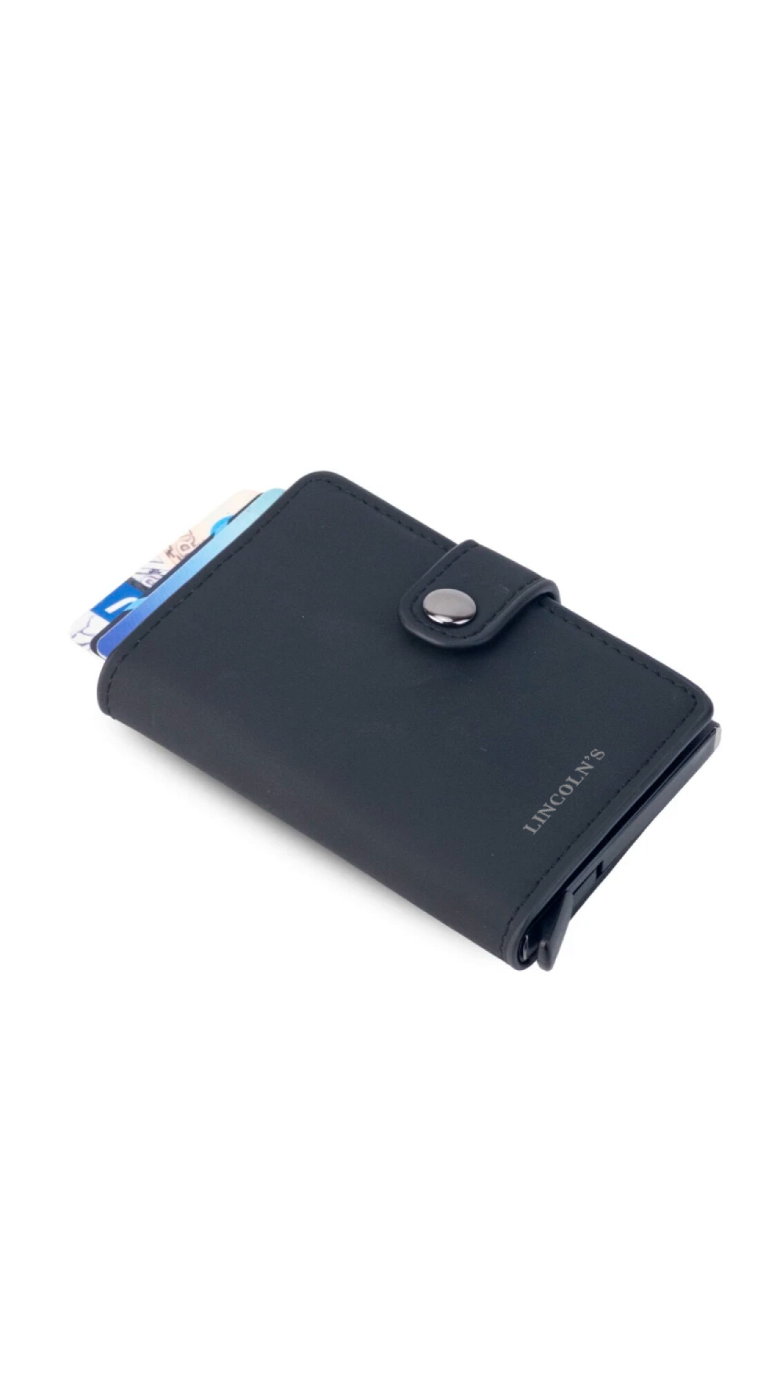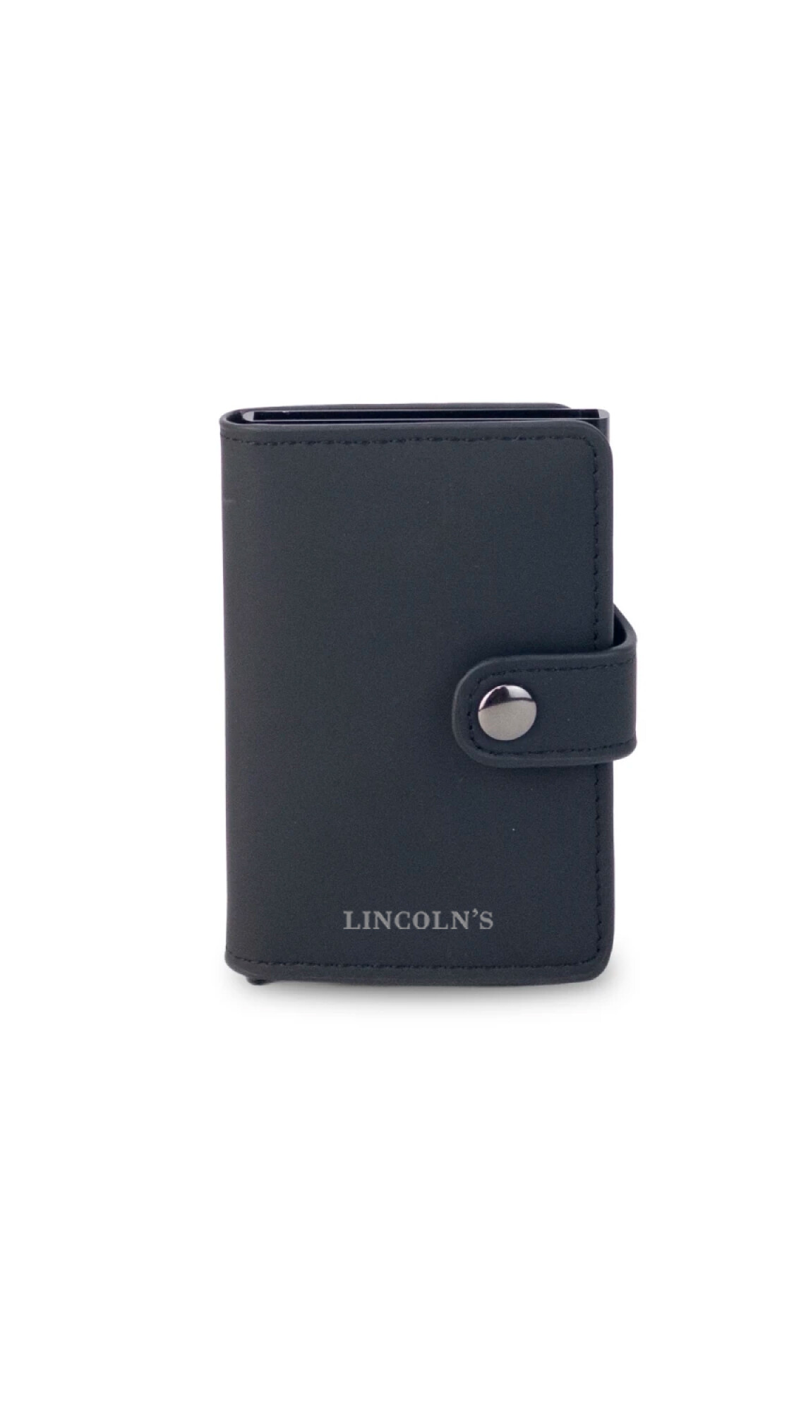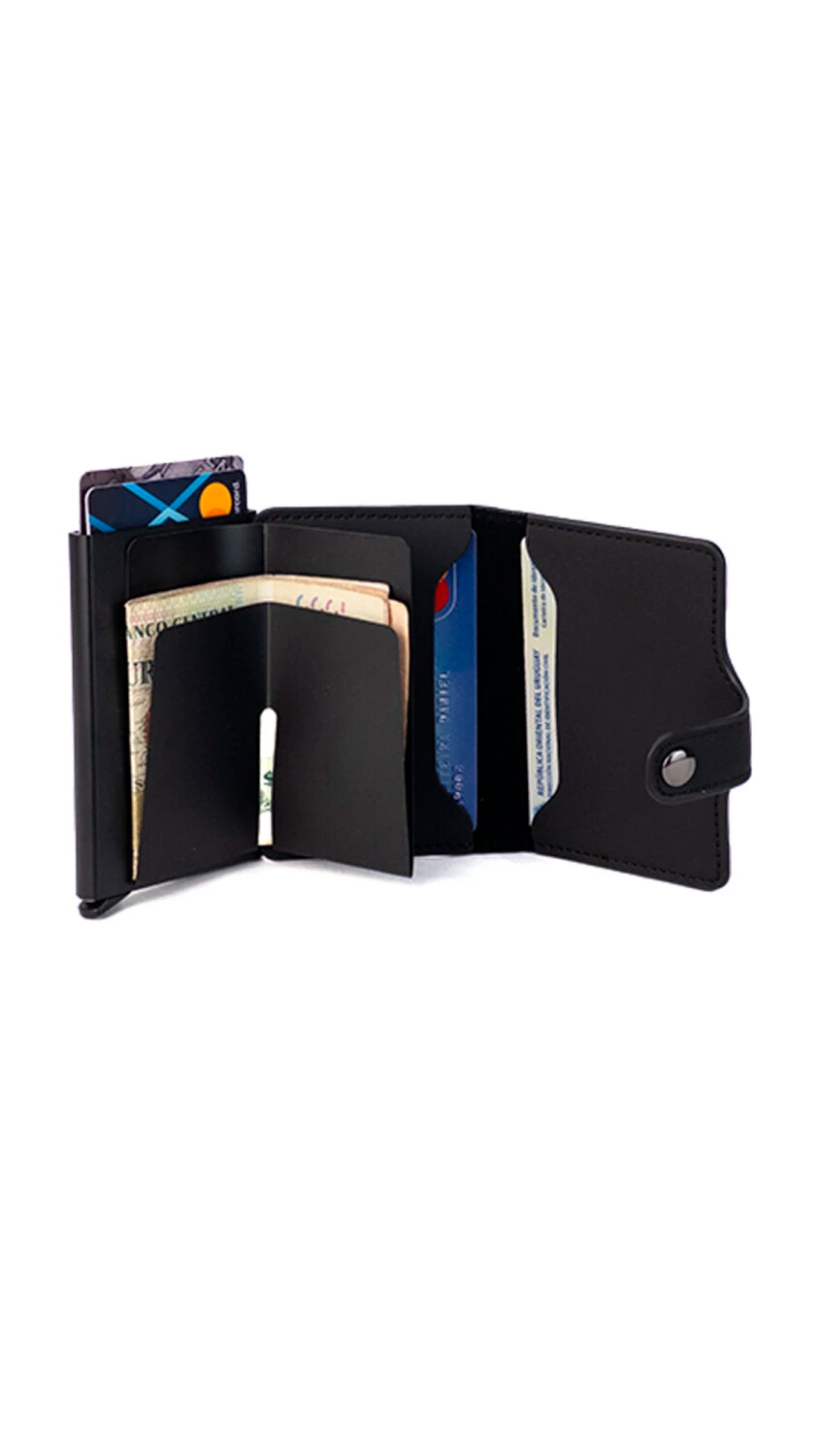 Tarjetero con sistema de portación anti clonación. Diseño compacto y elegante, fabricado en símil cuero con presilla y broche metálico para mayor seguridad. Compartimiento interno para tarjetas y un espacio central para billetes doblados.