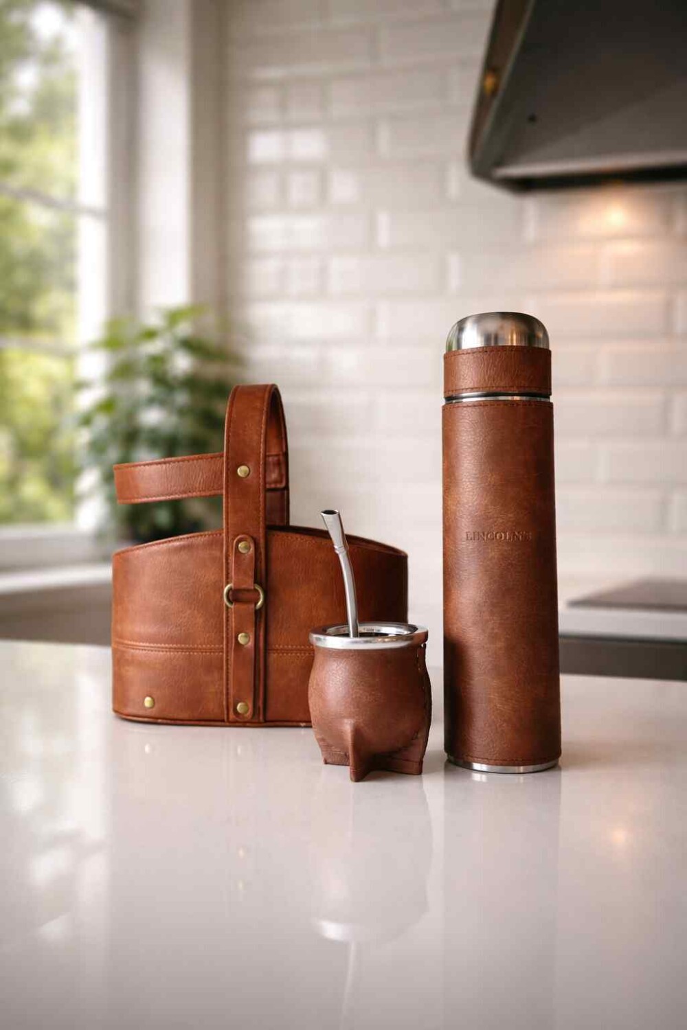 Termo de acero inoxidable forrado en símil cuero. Tapón con botón cebador. Capacidad 1 Litro. Conserva frío y calor.