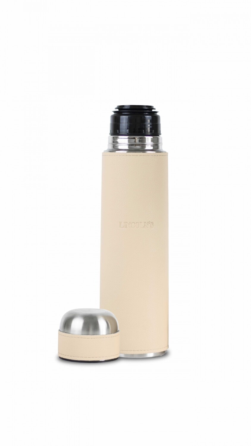 Termo de acero inoxidable forrado en símil cuero. Tapón con botón cebador. Capacidad 1 Litro. Conserva frío y calor.