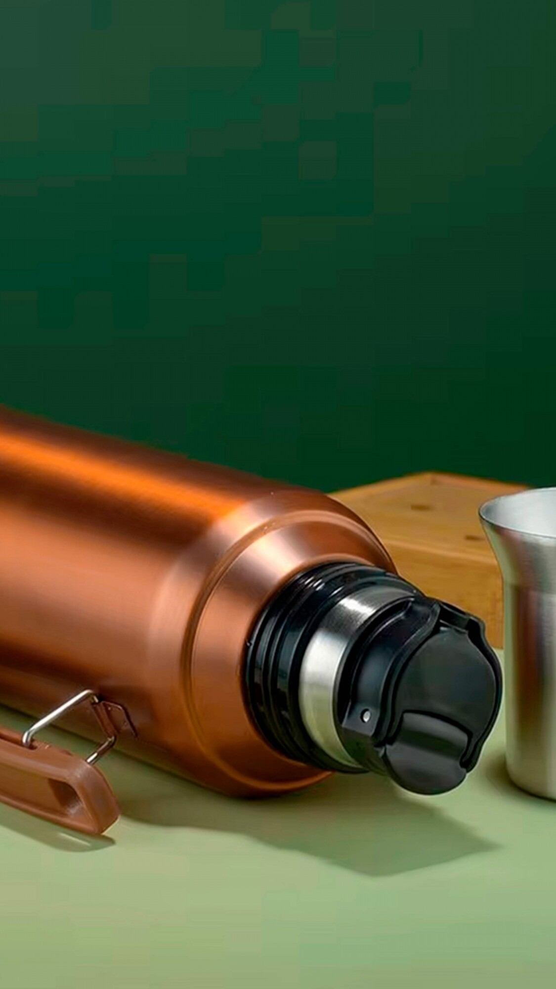 Termo con doble pared de acero inoxidable y asa plegable. Tapón a prueba de fugas. Conserva frío y calor por hasta 24 hs. Capacidad 1.200 ml.