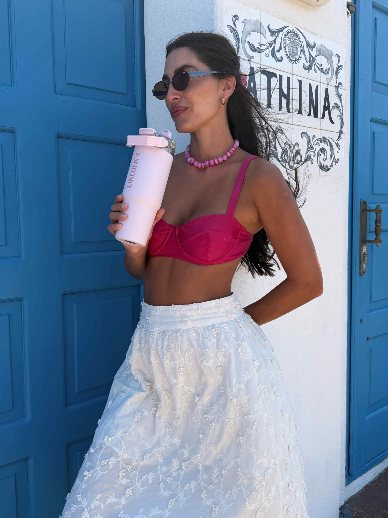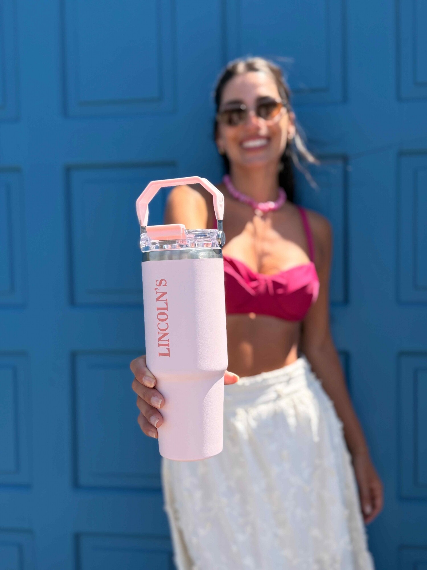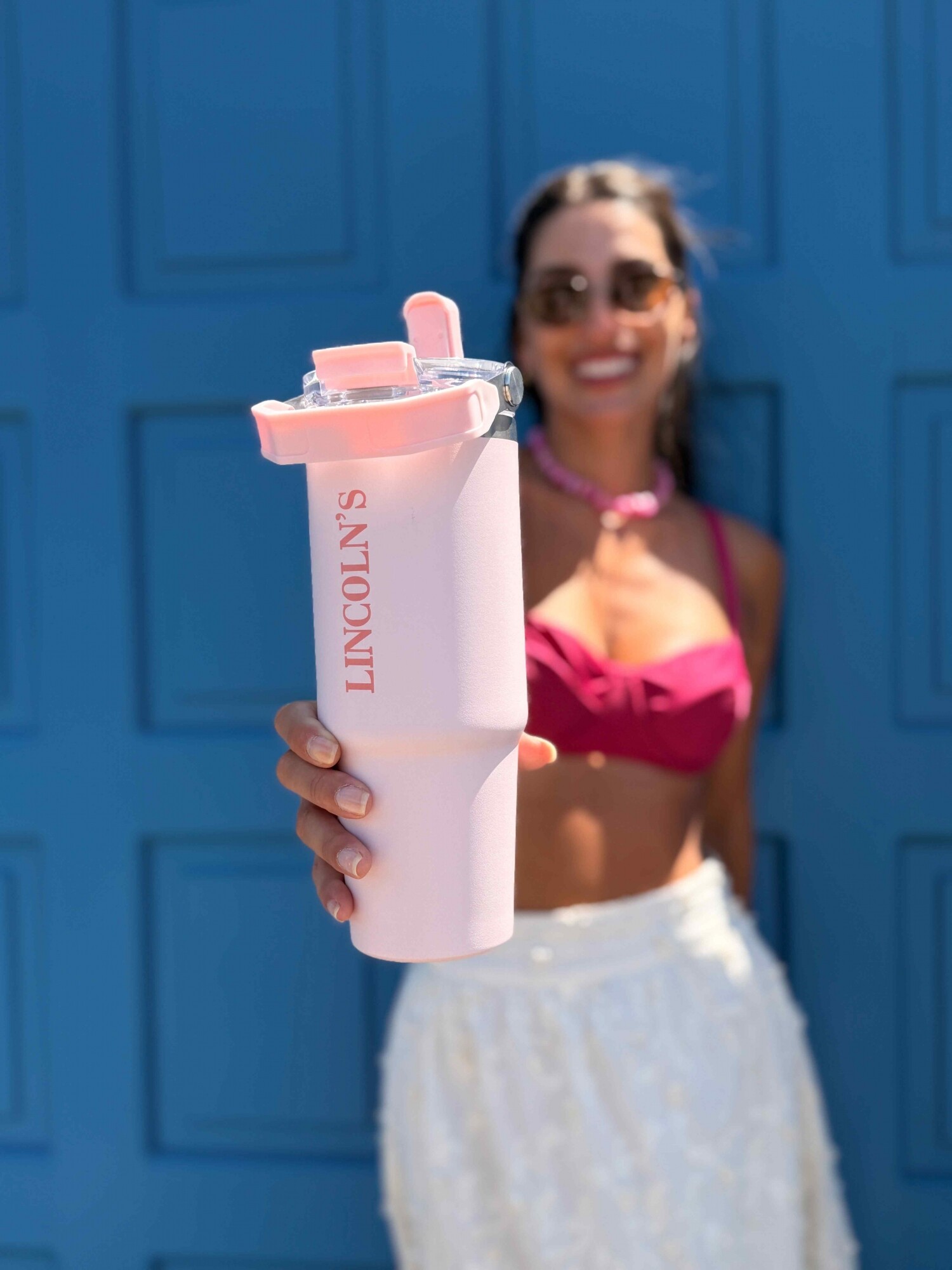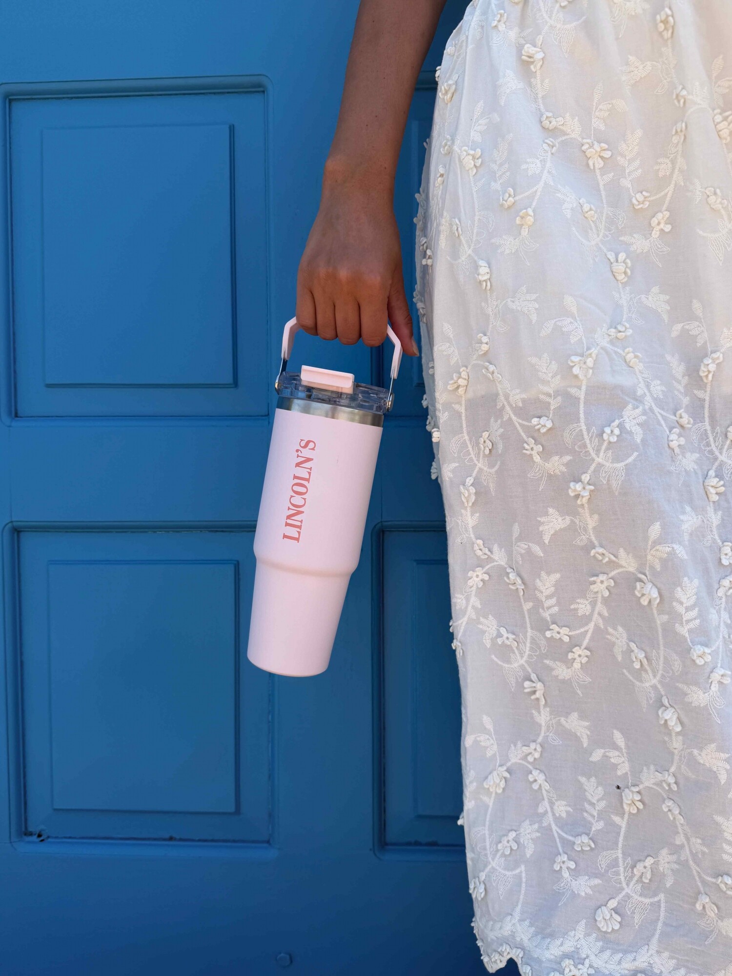Vaso térmico de 887 ml. Fabricado en acero inoxidable, conserva el frío o el calor por horas. Con pico y asa cómoda resistente, ideal para acompañarte a donde vayas.